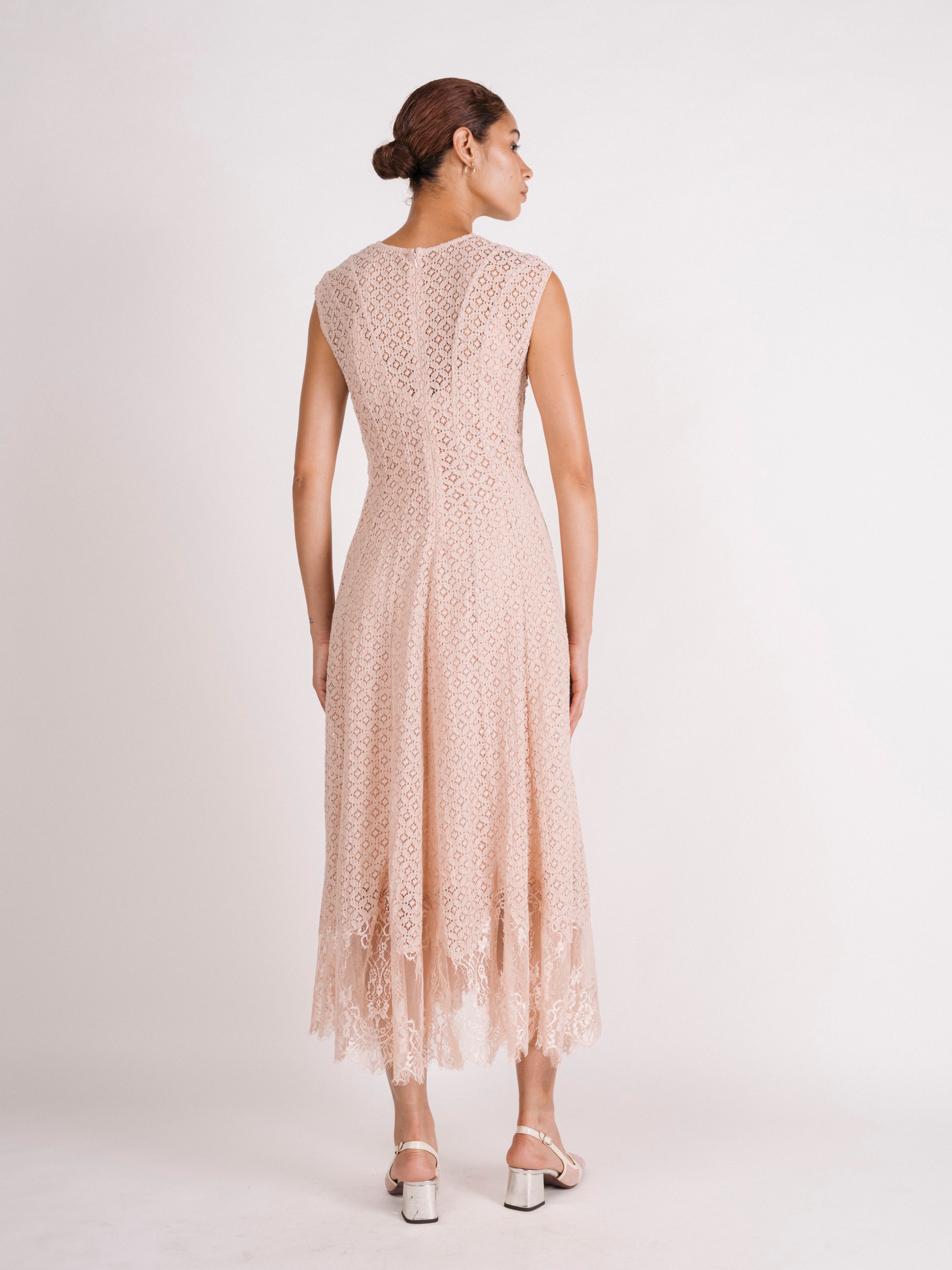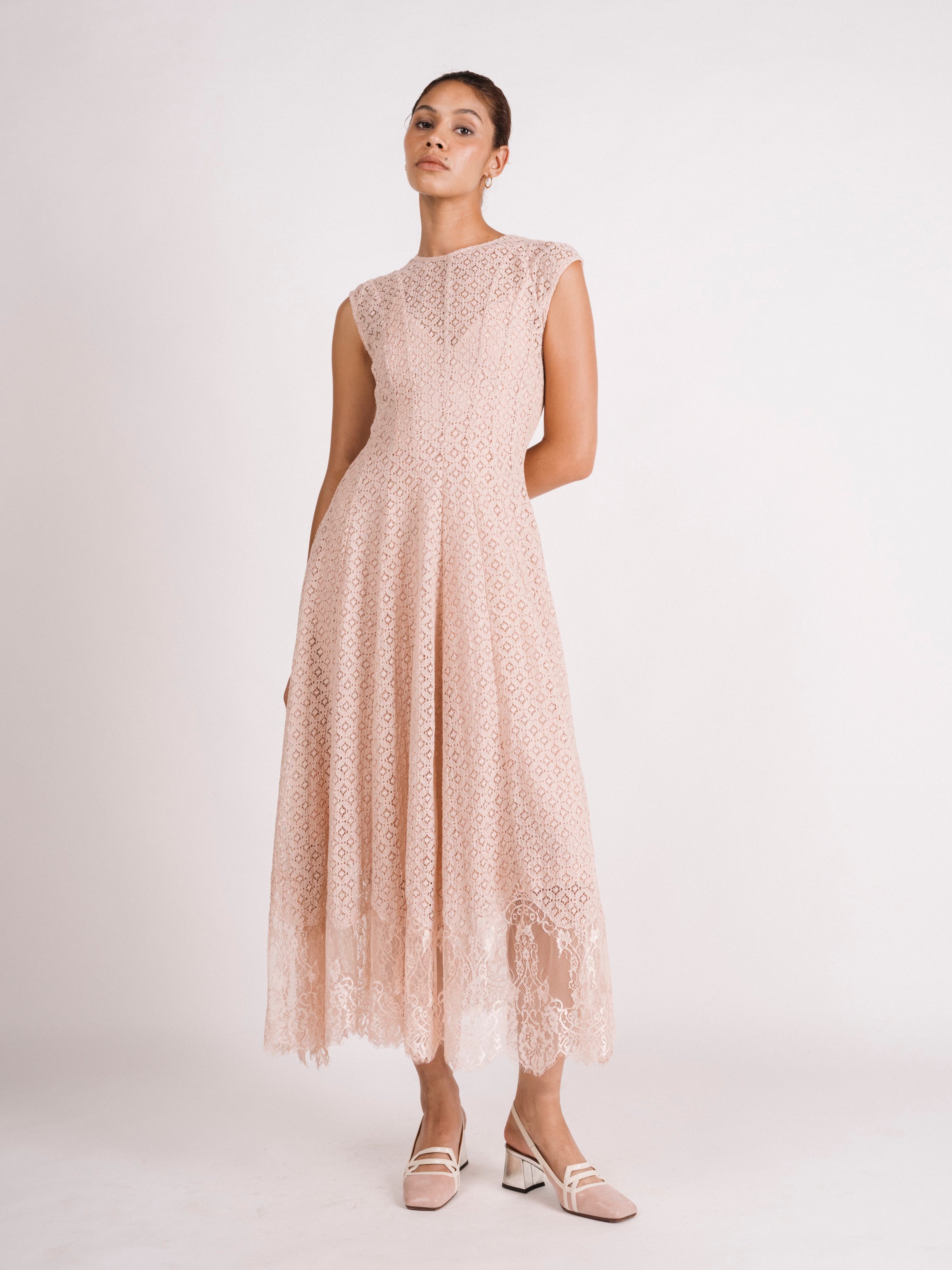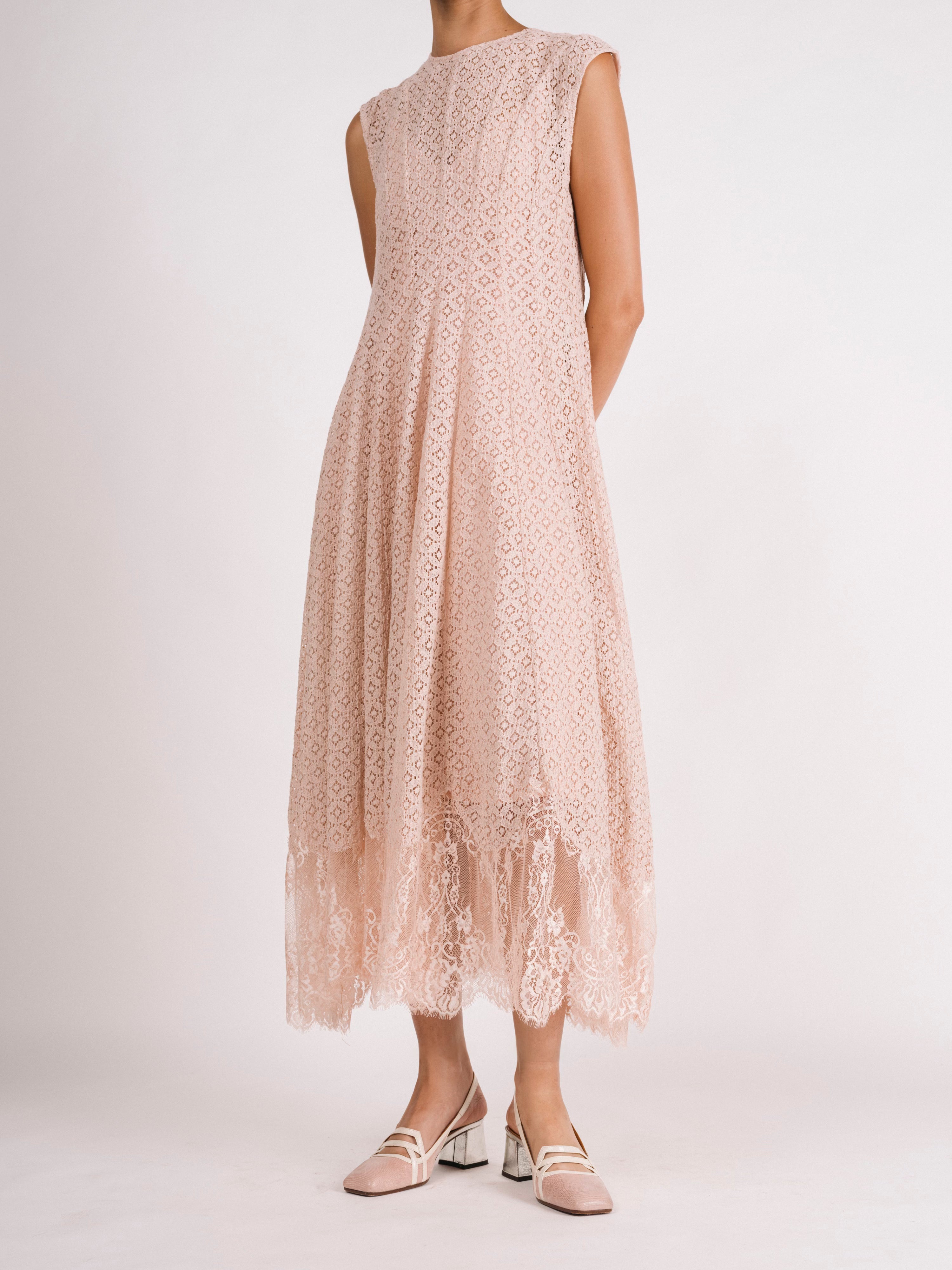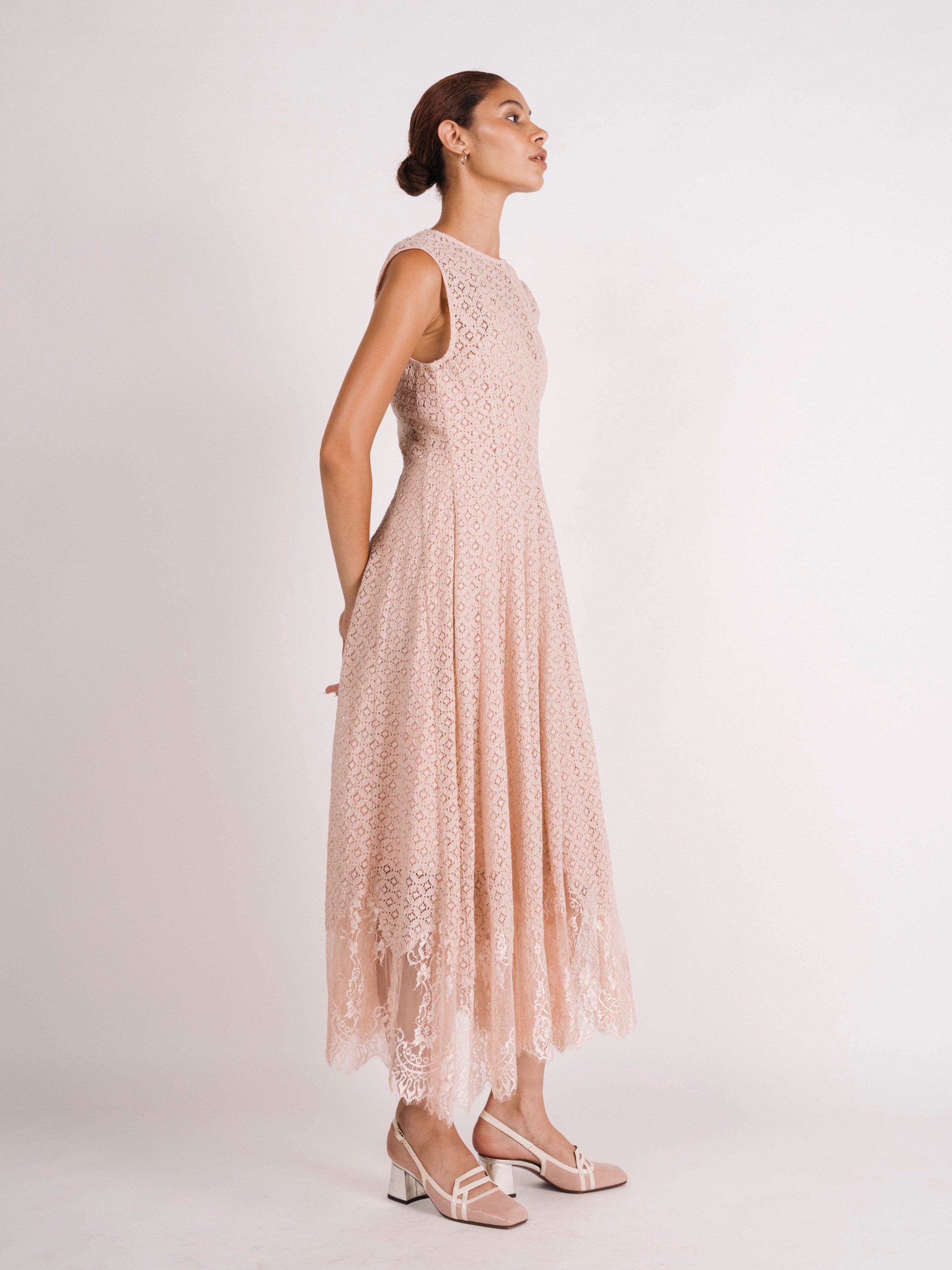 This lace dress weaves a delicate story, where two intricate laces meet at the hem, their union crowned with a graceful scallop. The harmonious blend of textures dances softly, creating a timeless elegance that lingers with every step.