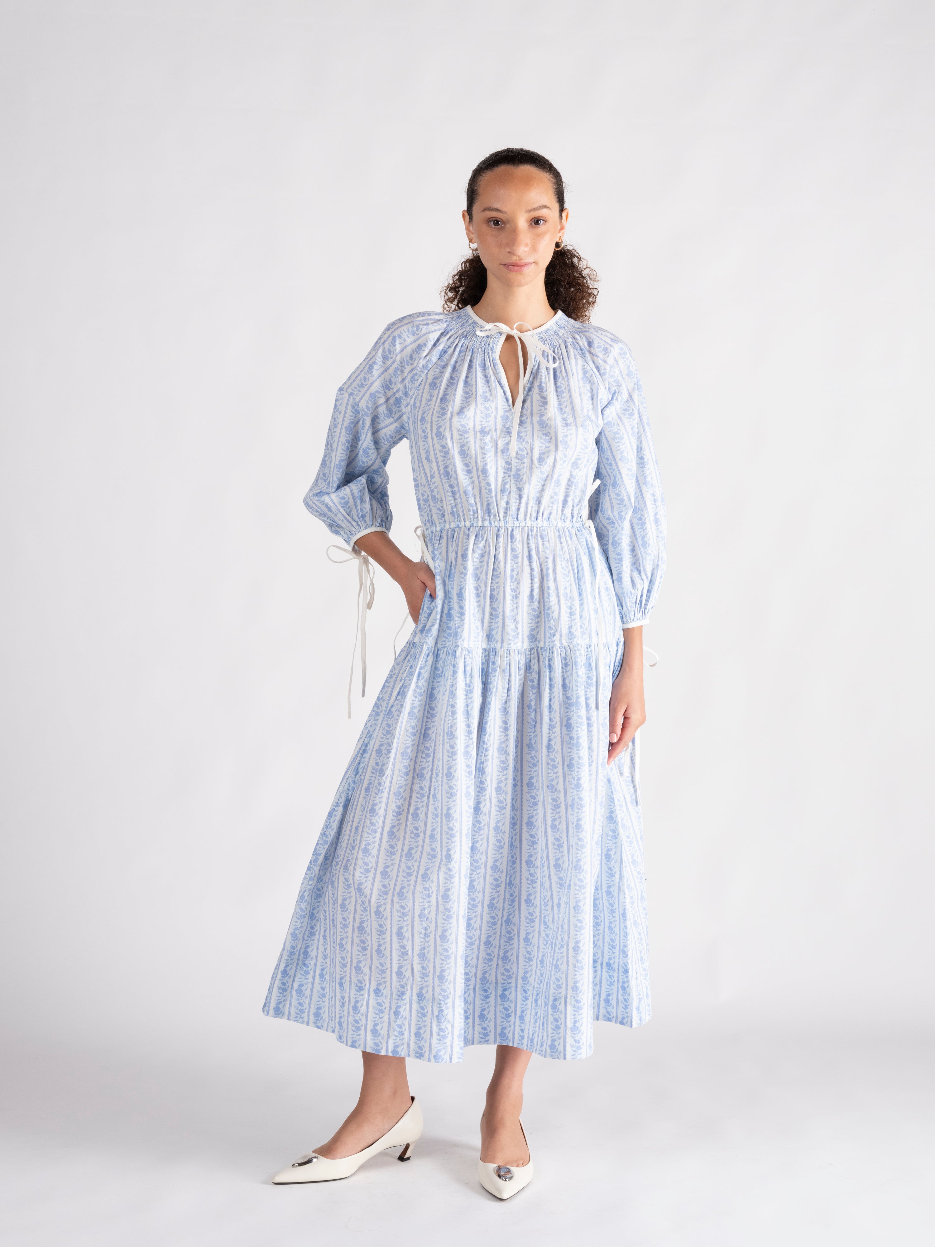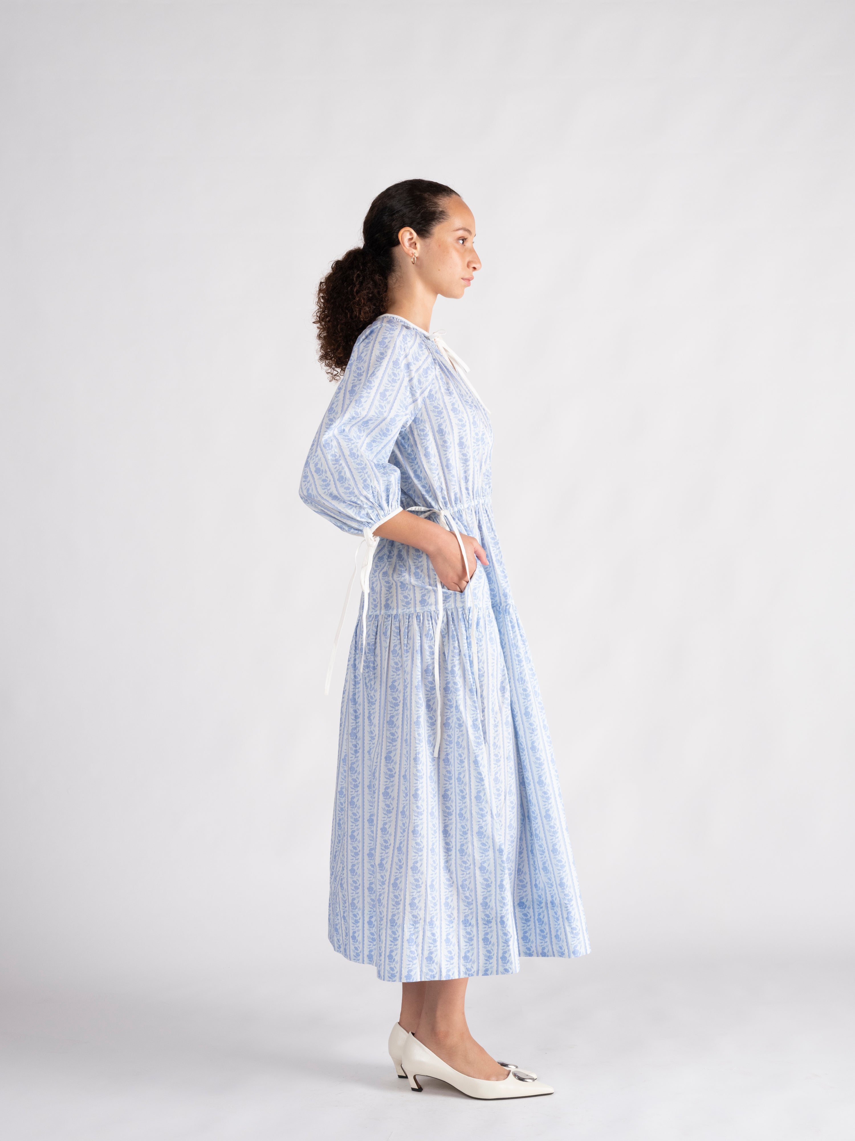 Cinched at the waist and flowing with effortless grace, this tea-length dress moves like a quiet melody, accentuating every step with elegance. The delicate tie-neck frames the wearer with timeless charm, evoking a sense of confidence, poise, and the kind of beauty that lingers long after she’s left the room.