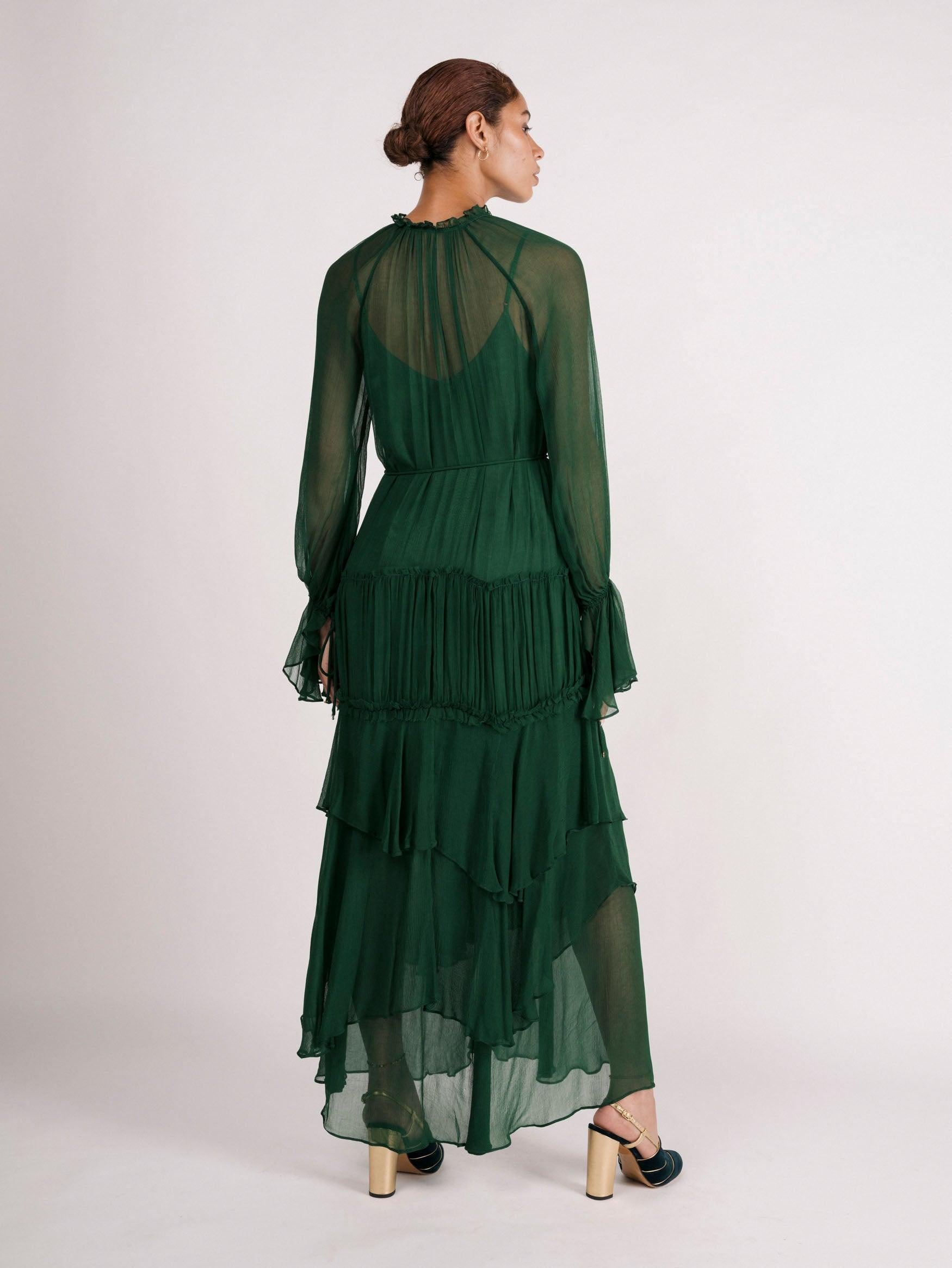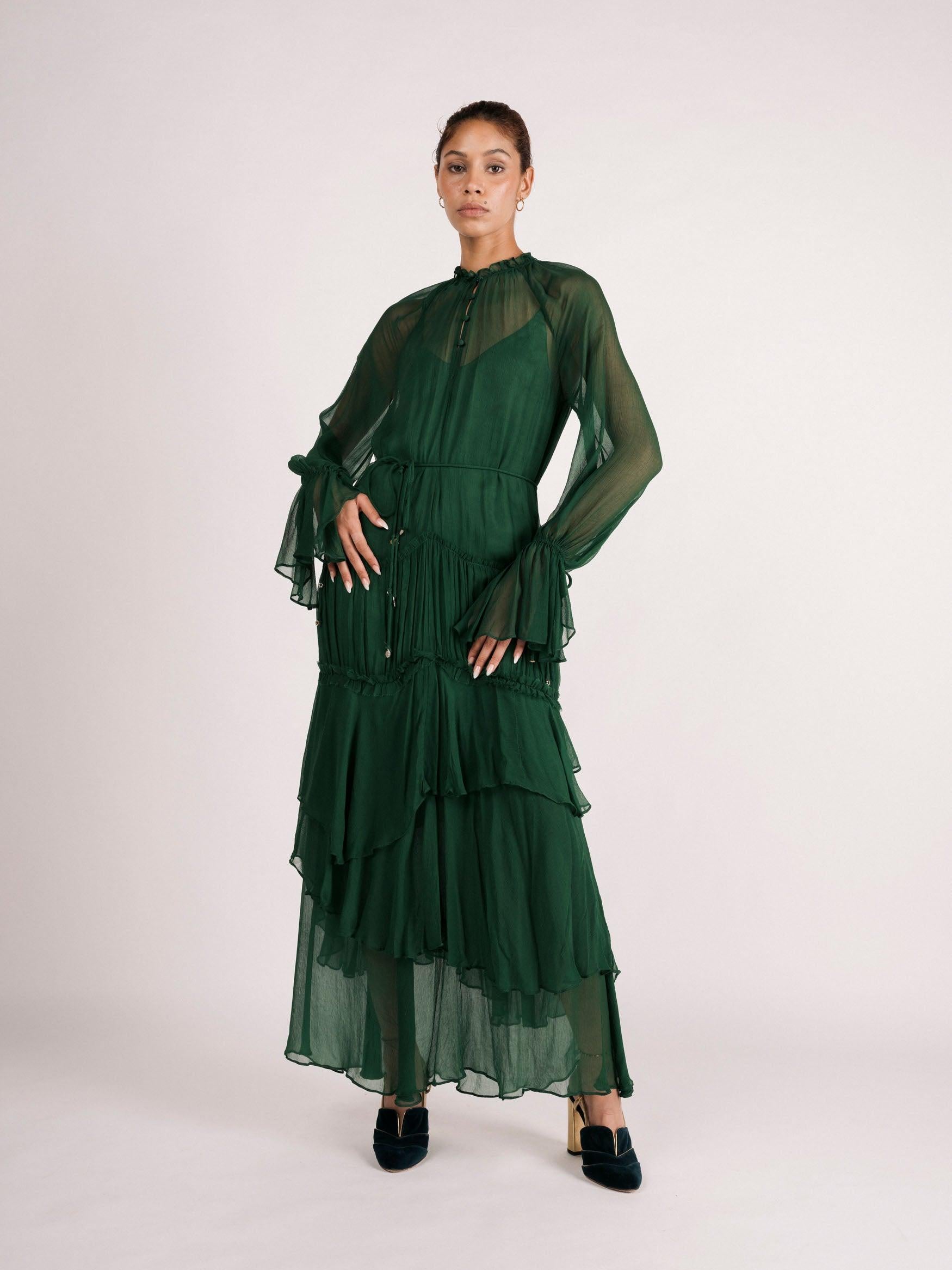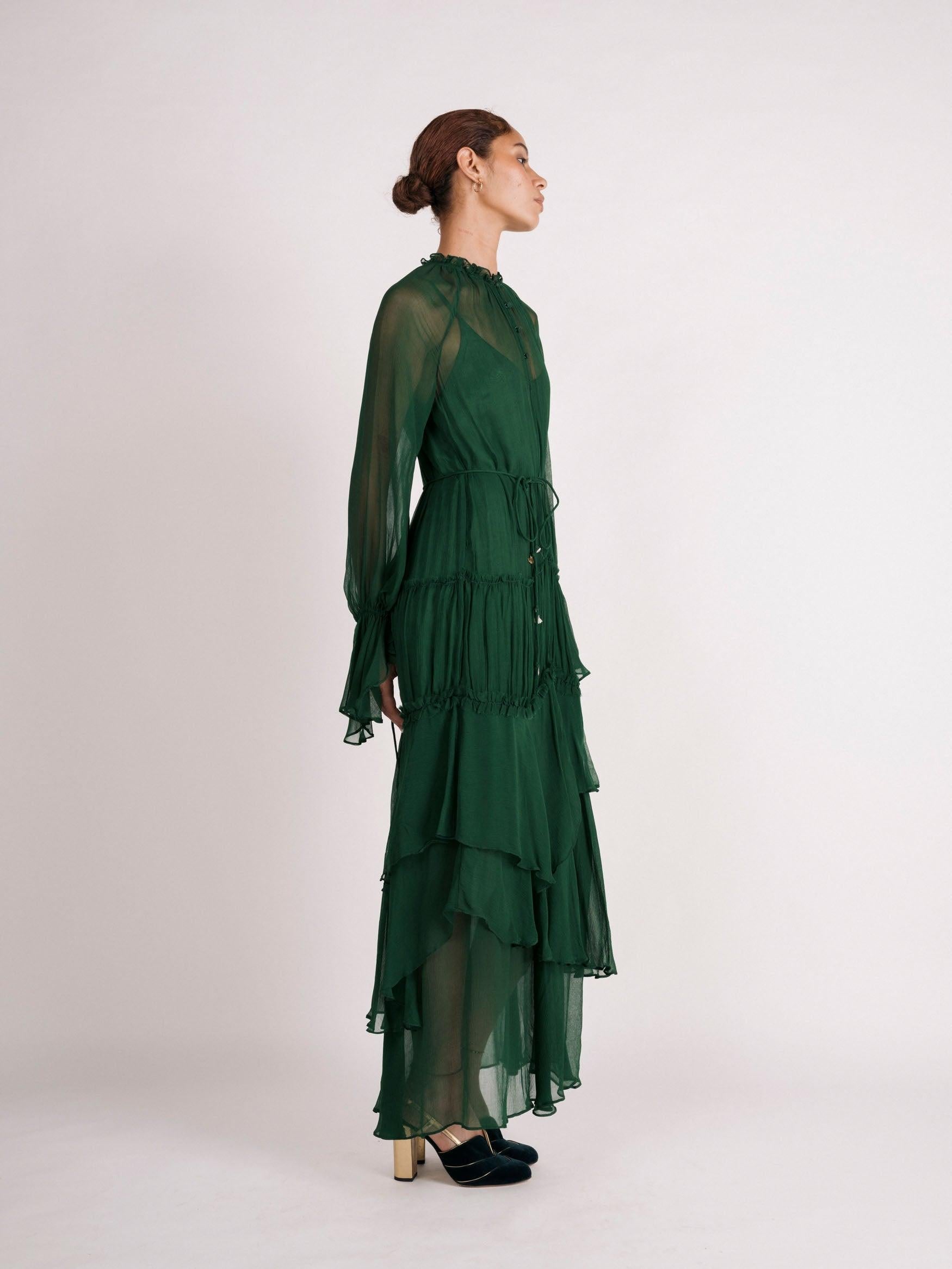 Crinkle chiffon ruffles cascade down the body in this tiered maxi dress. Option to keep ruffled neckline closed or open with buttons down the front. Hand-picked charms adorn the ties of sleeves and the optional spaghetti belt. Dress is lined with a separate satin lining slip dress.