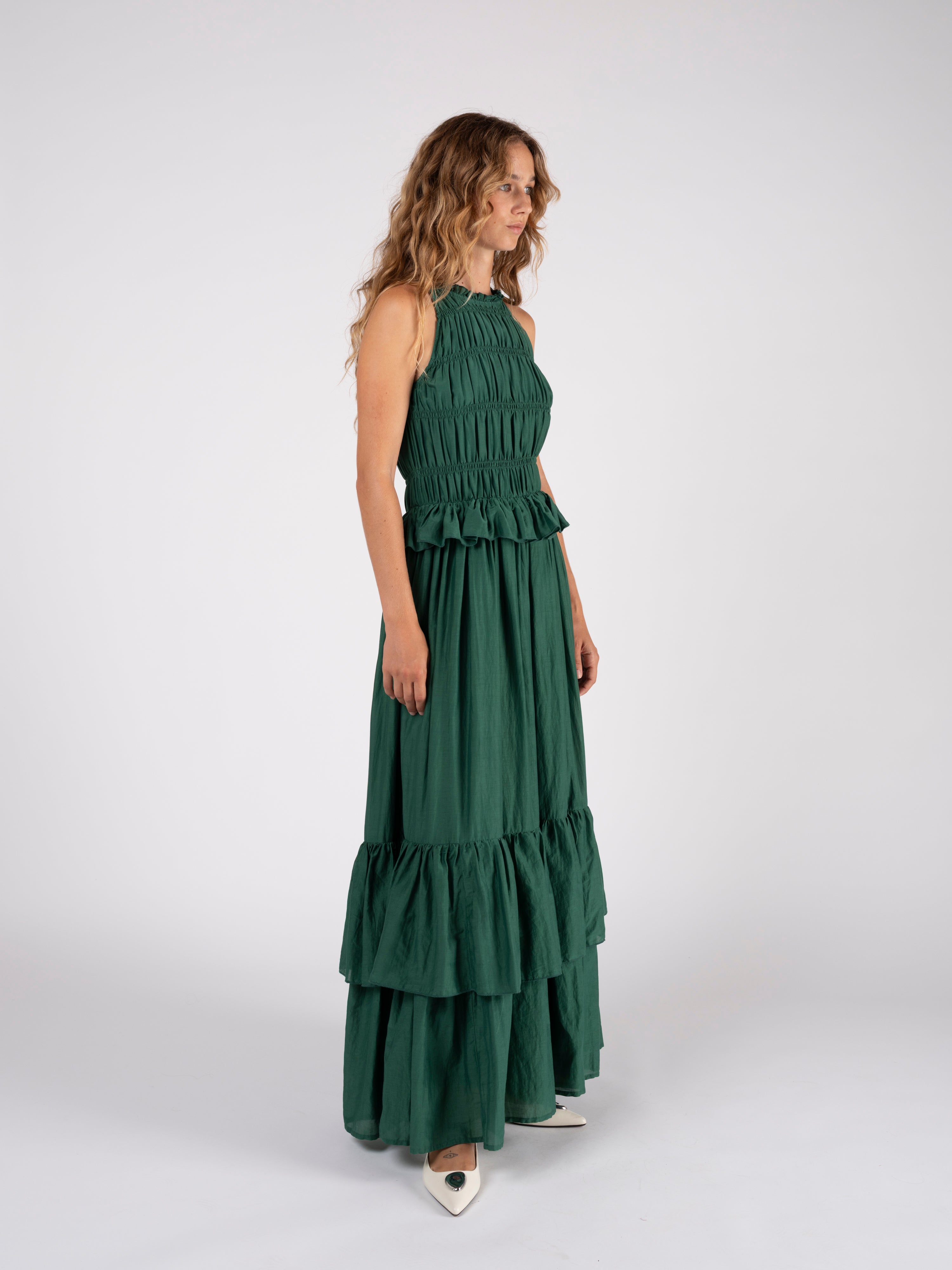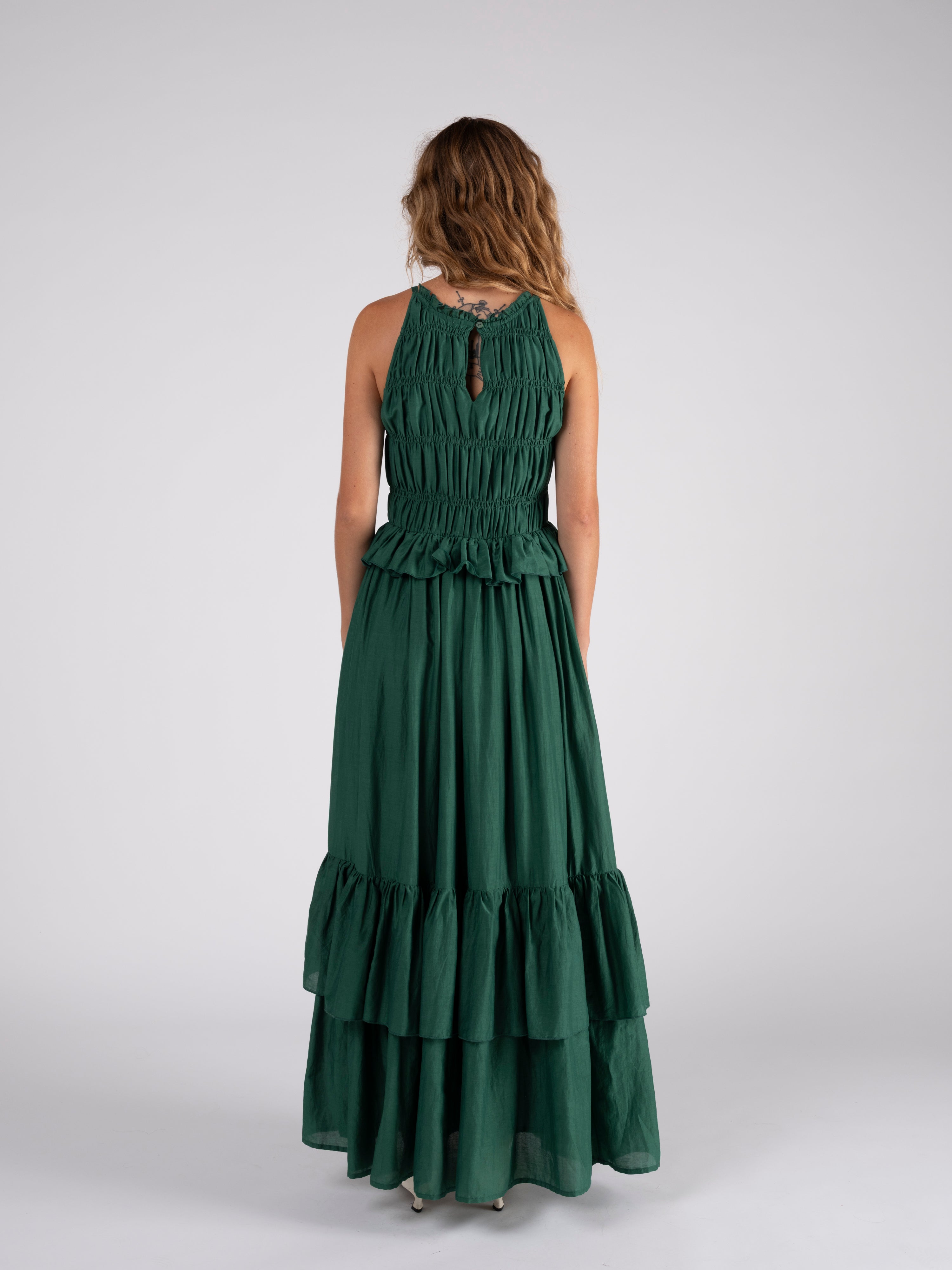 Sleeveless cotton silk maxi dress featuring a halter neckline and a smocked bodice extending into a peplum waist. Bodice overlayed in delicate lace. Ruffled hemline. Lined in cotton voile.