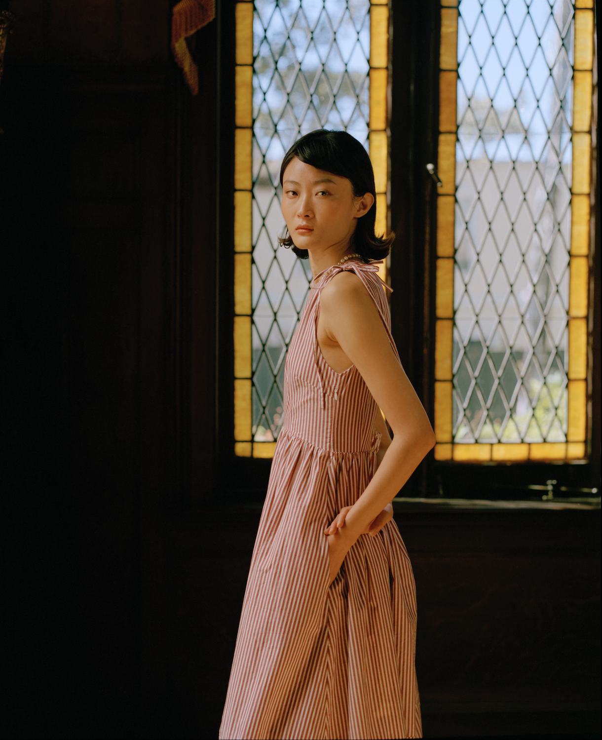 Cotton poplin maxi tent dress with optional spaghetti belt. Front and back V-neckline, accentuated with pleating details. Lightweight cotton voile lining.