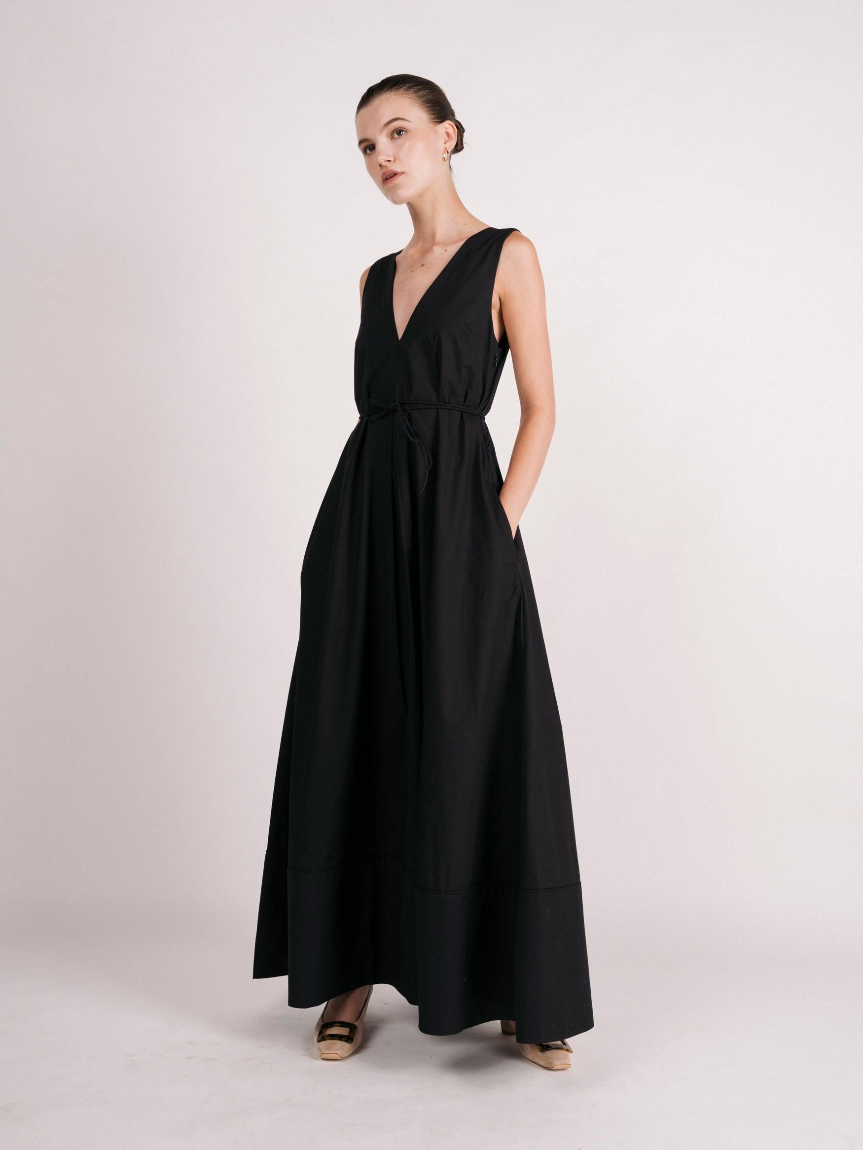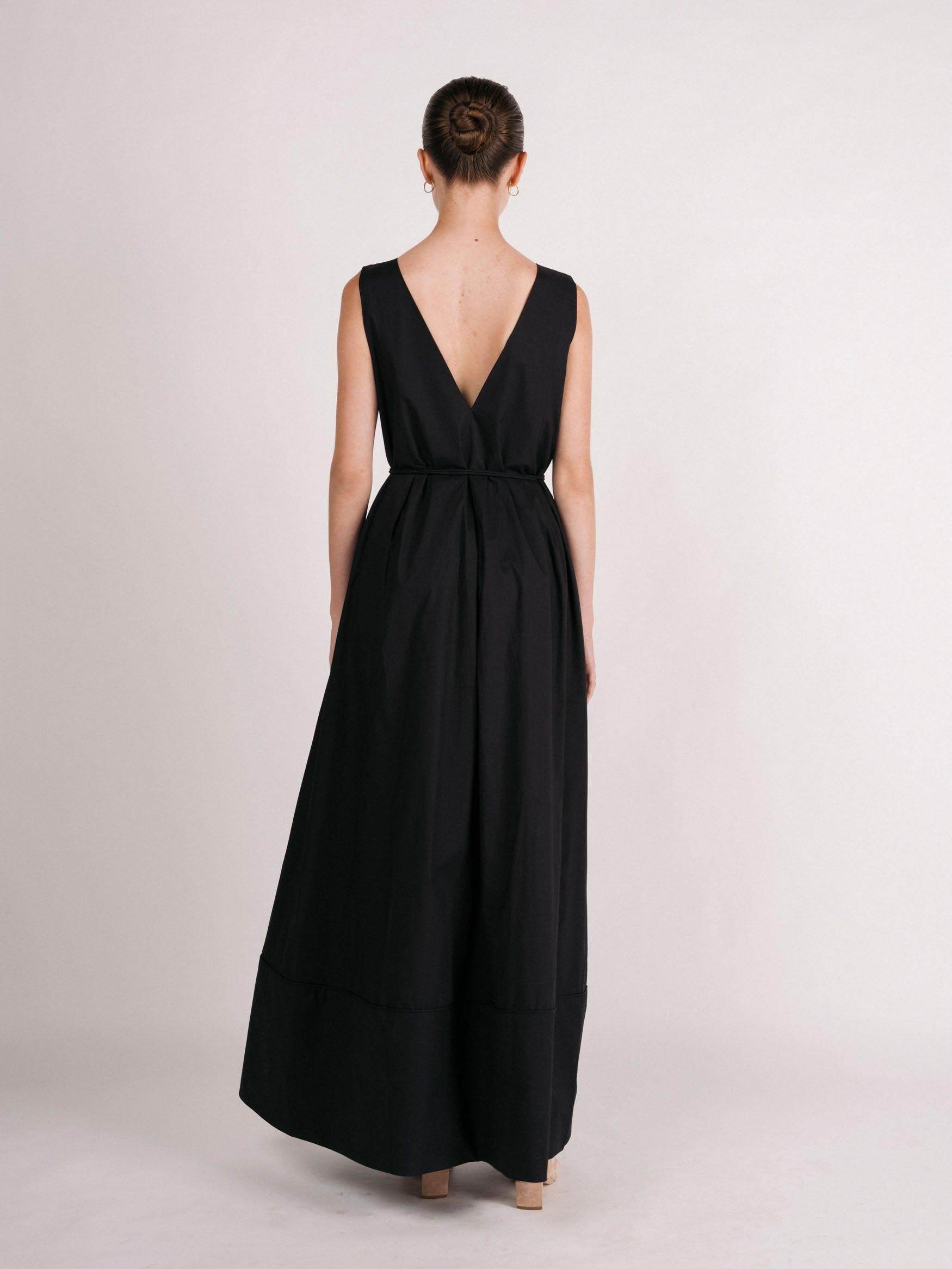 Cotton poplin maxi tent dress with optional spaghetti belt. Front and back V-neckline, accentuated with pleating details. Lightweight cotton voile lining.