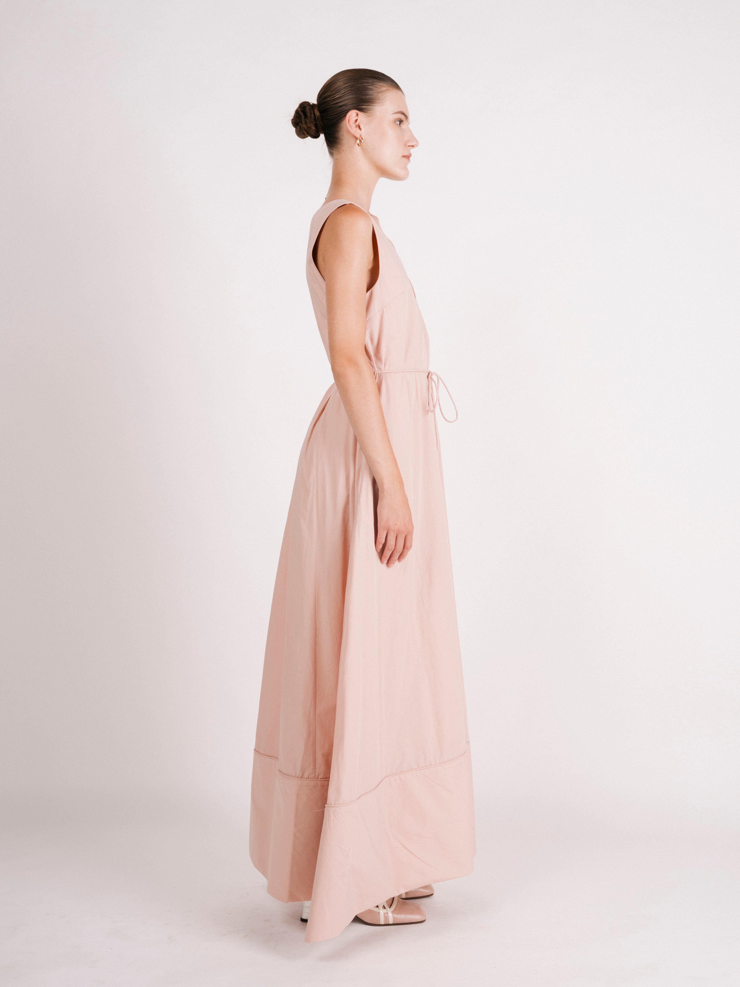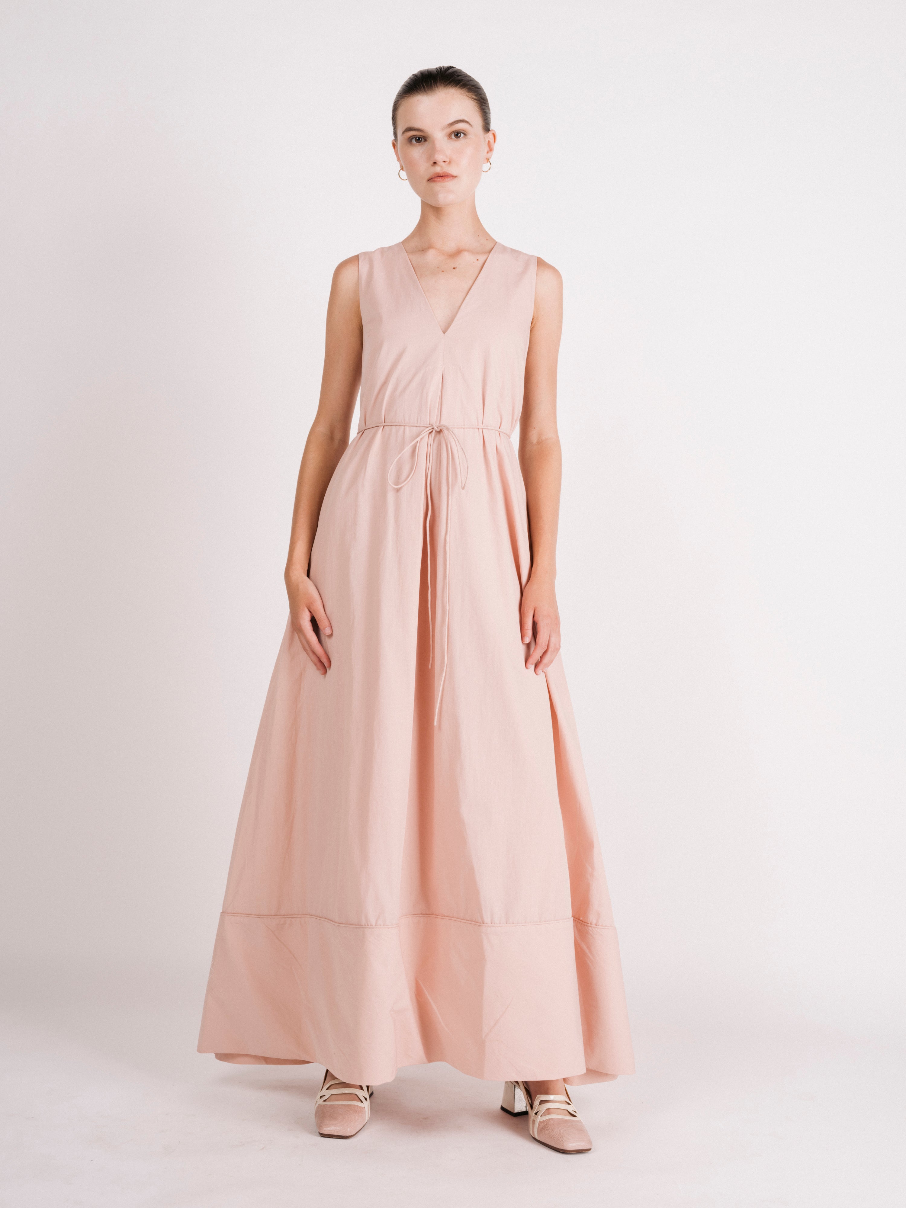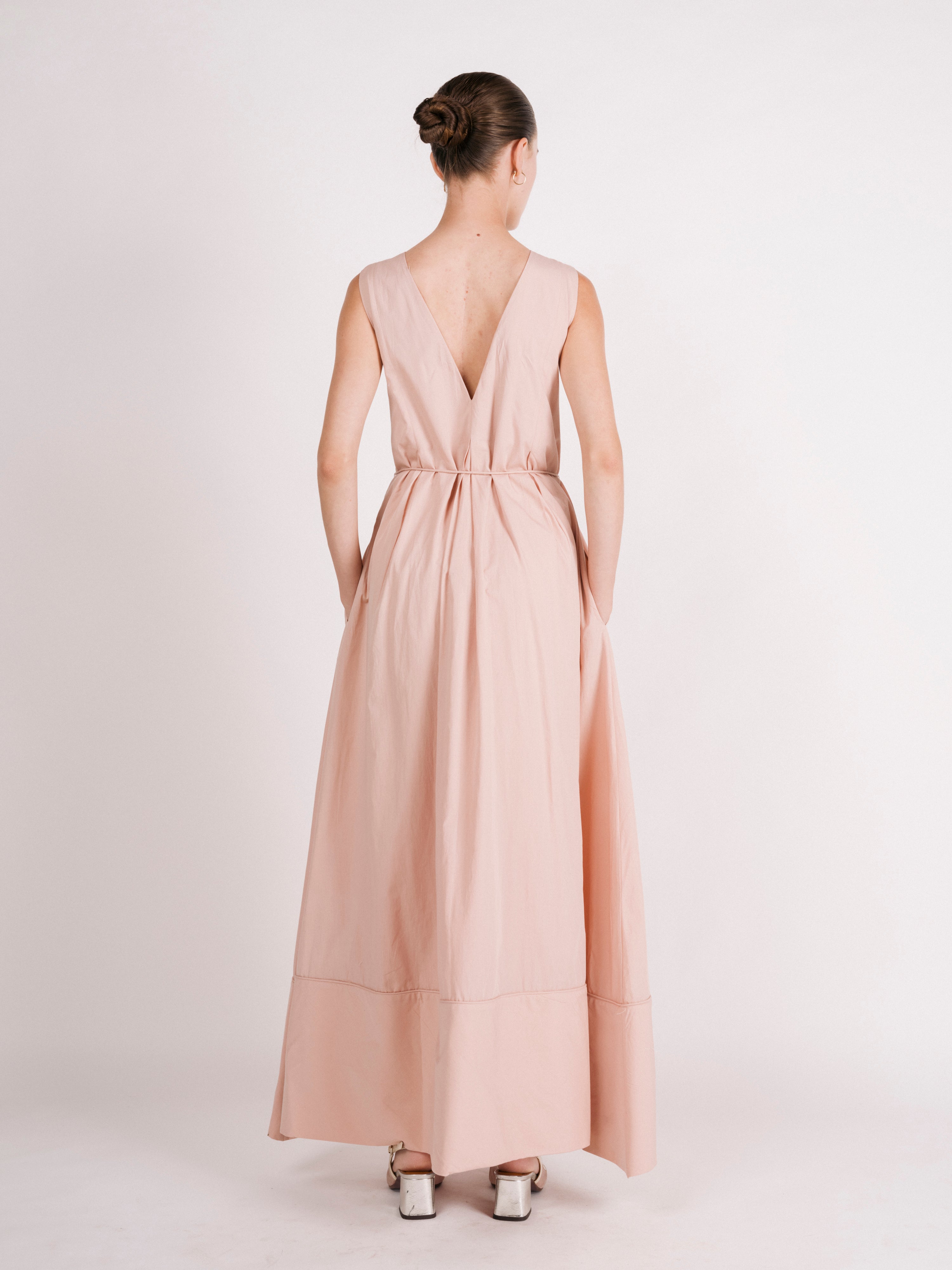 Cotton poplin maxi ankle length tent dress with optional spaghetti belt. Front and back V-neckline, accentuated with pleating details. Lightweight cotton voile lining.