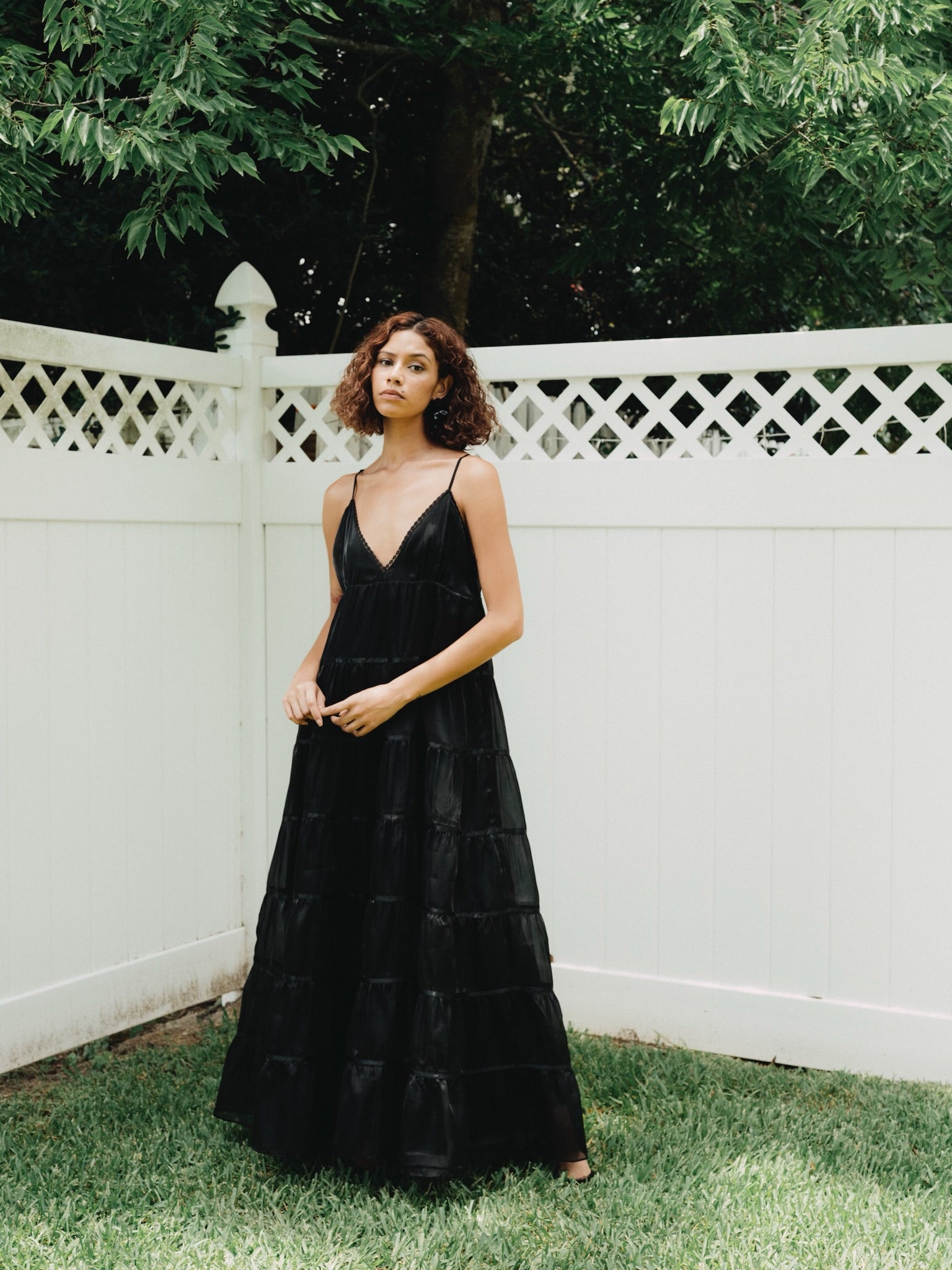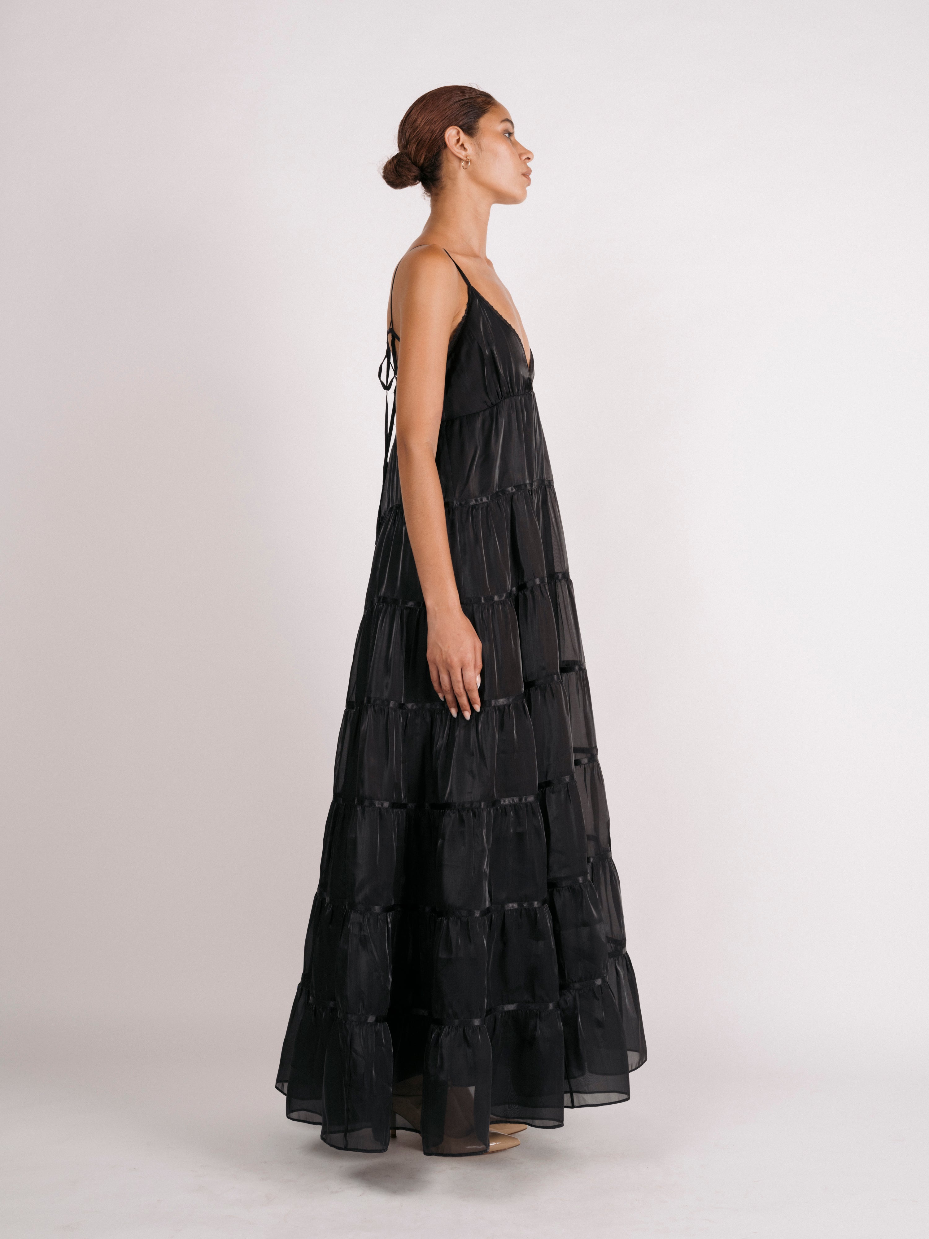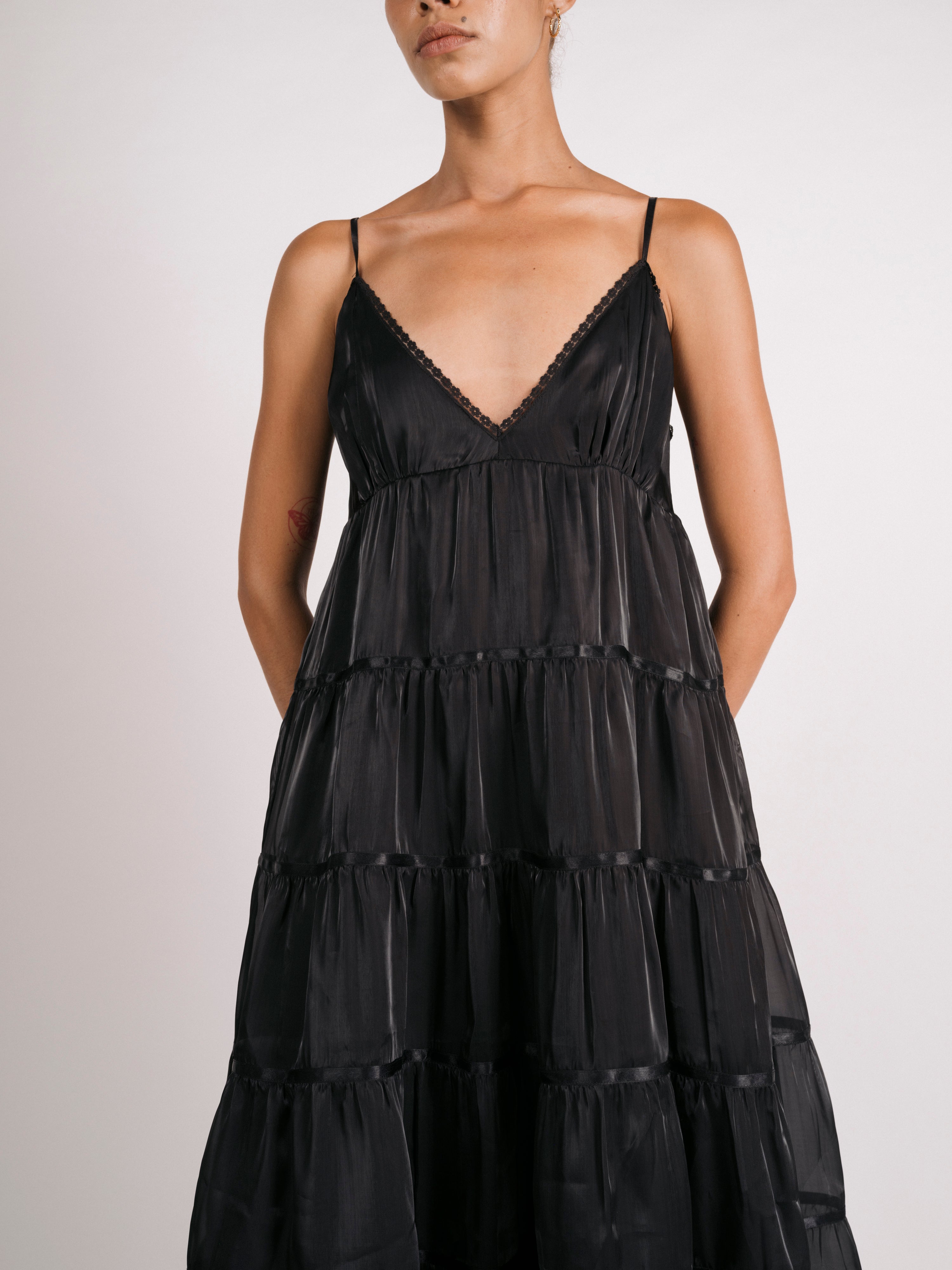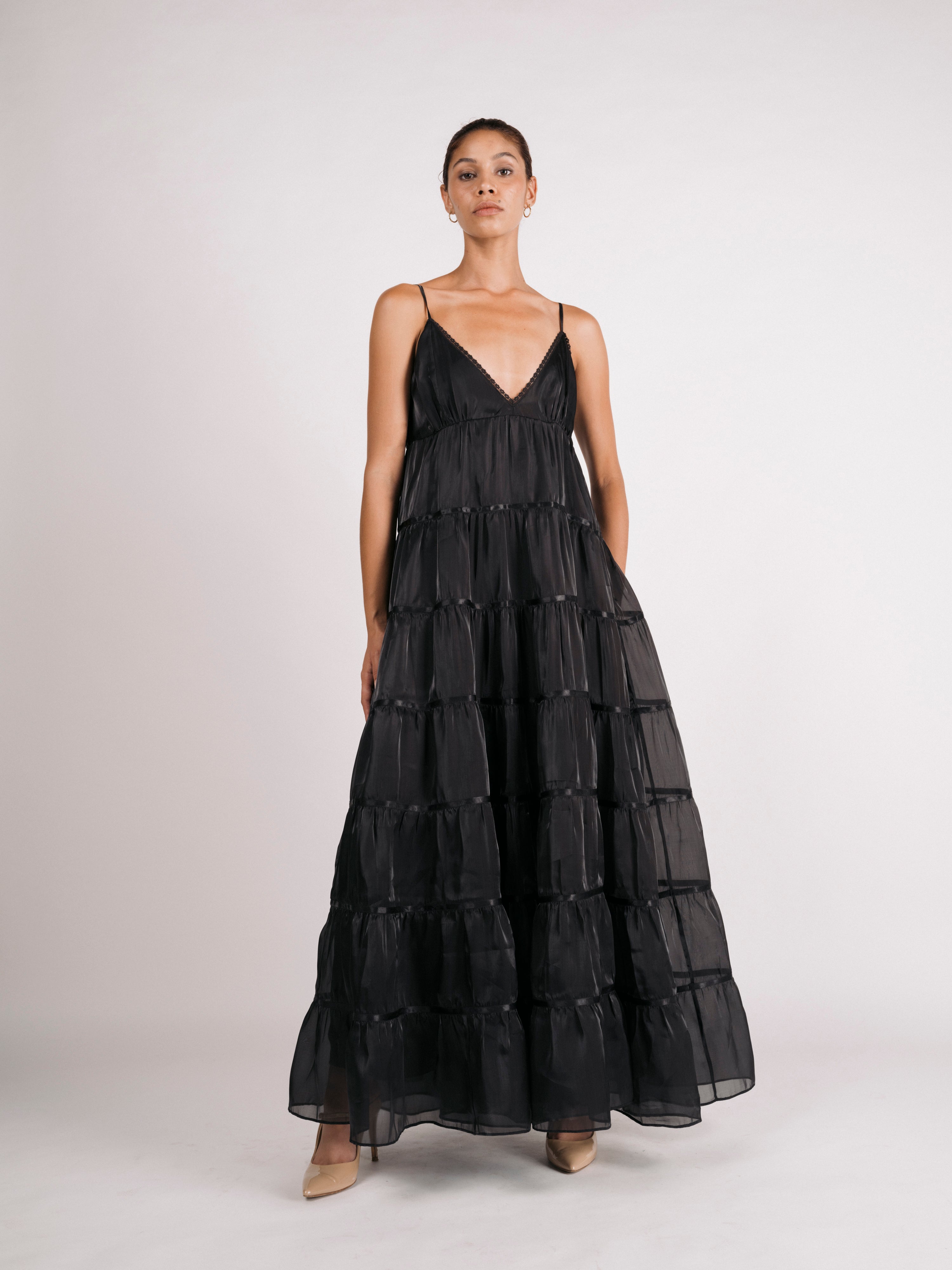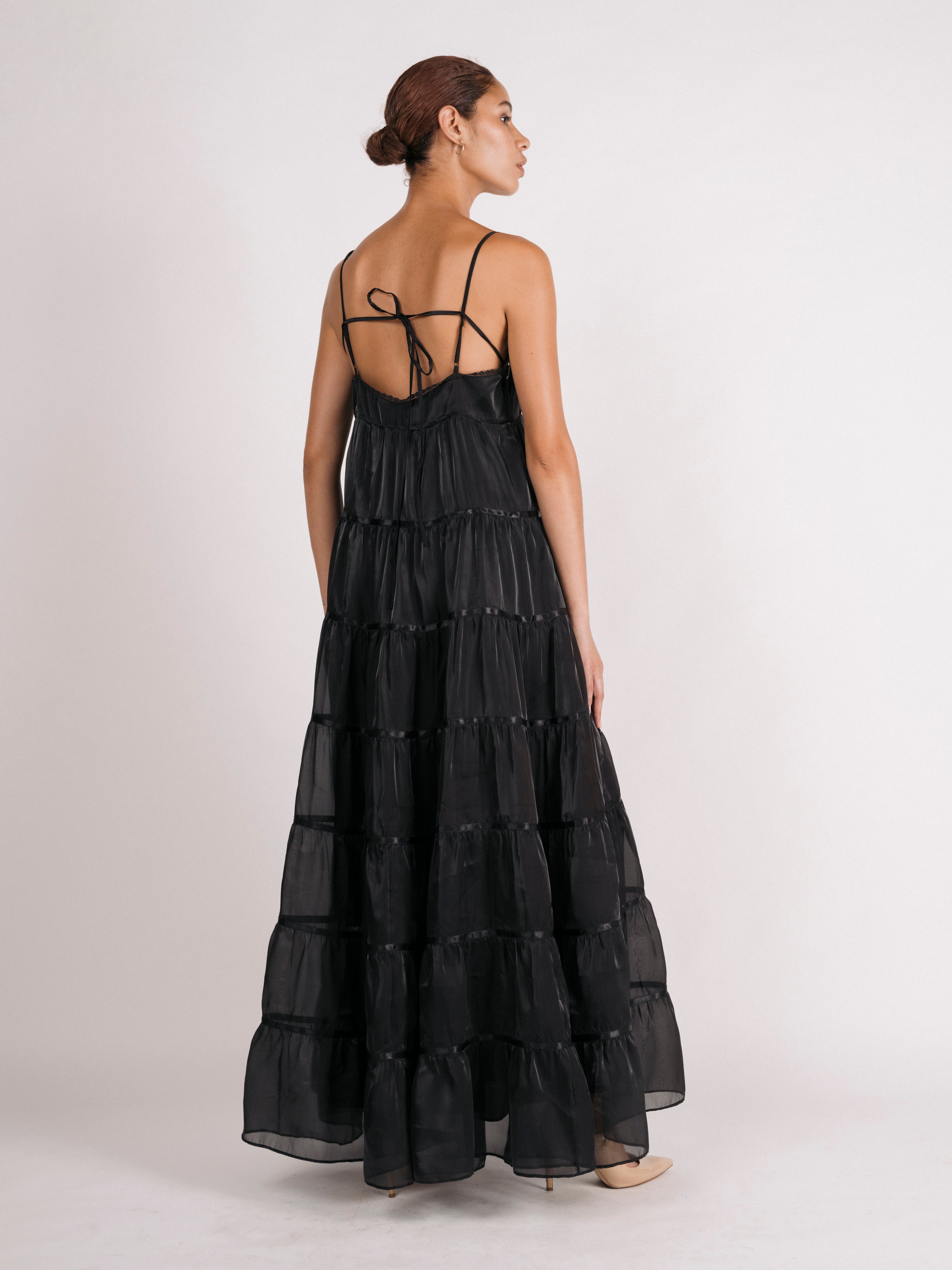 Tiers of semi-sheer, lustrous organza cascade towards the hem of the Margaret dress. Voluminous skirt tiers are trimmed in satin ribbons, v-neckline is finished with scallop lace. Spaghetti straps are adjustable, option to style dress with (as photographed) our without side ties across the back bodice. Bodice and skirt are fully lined in satin. Invisible side zipper closure