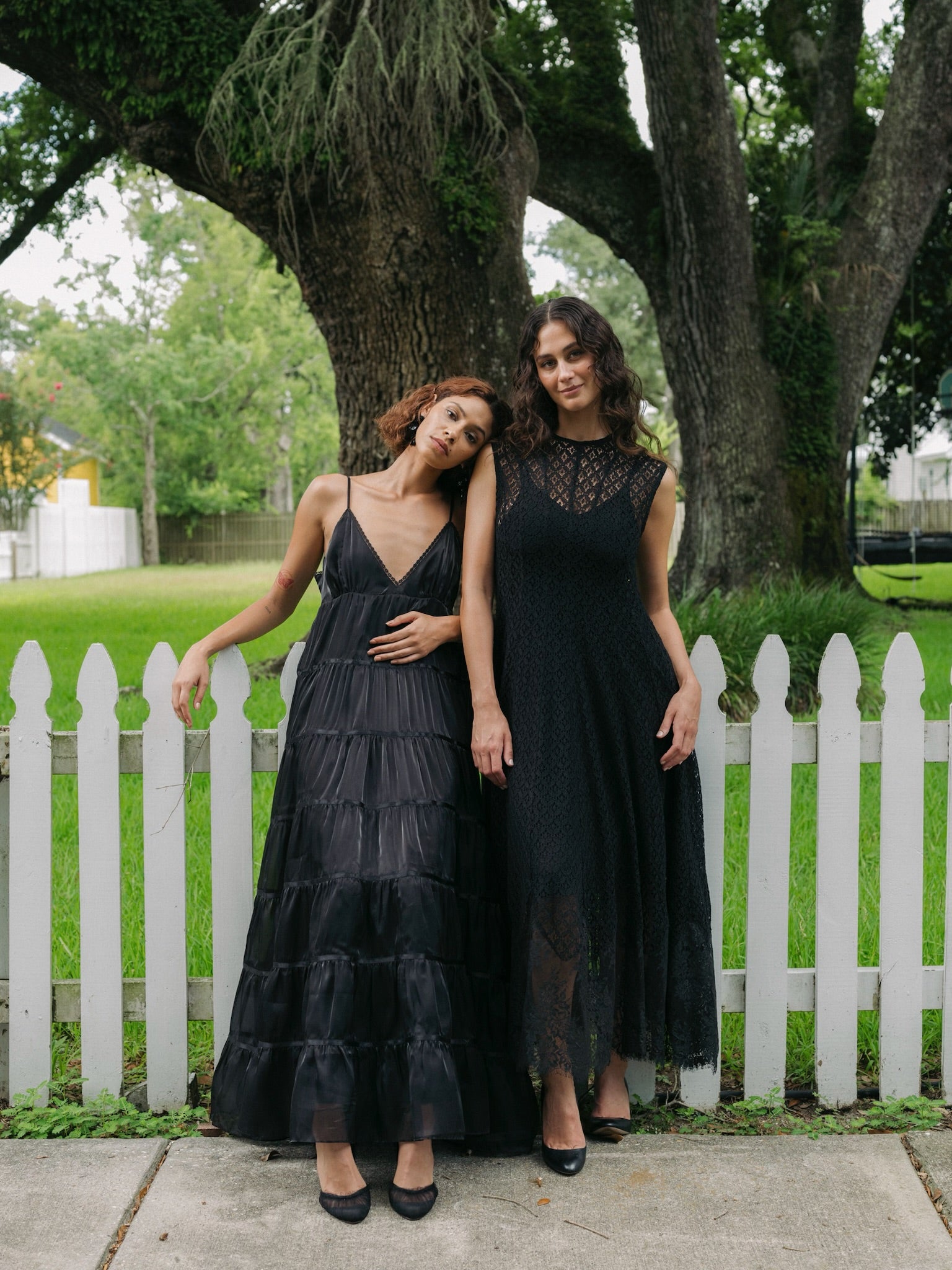 A black multi-tiered gown, lustrous and flowing like midnight satin, unfurls with each movement, capturing the essence of holiday elegance and timeless allure.
