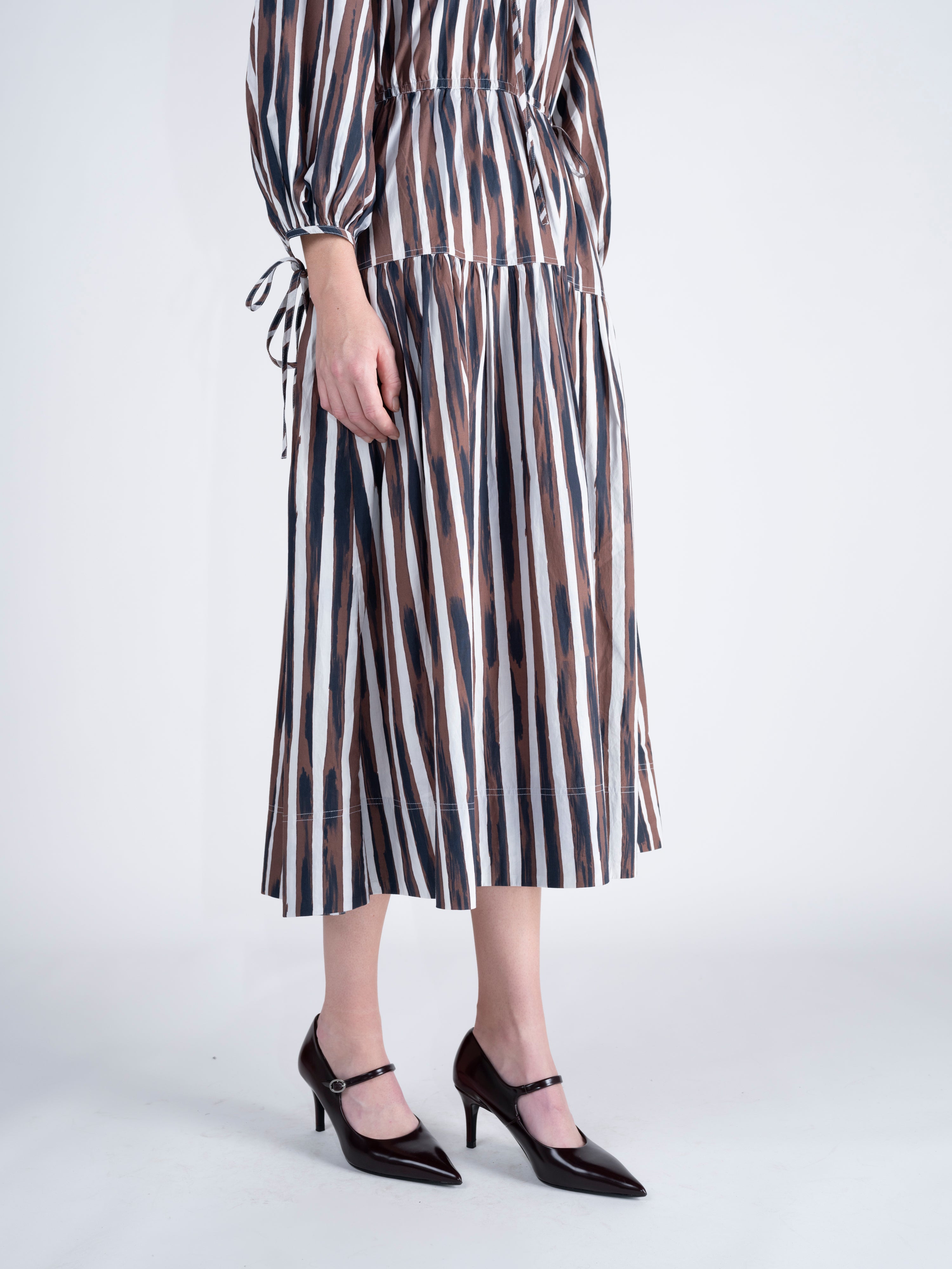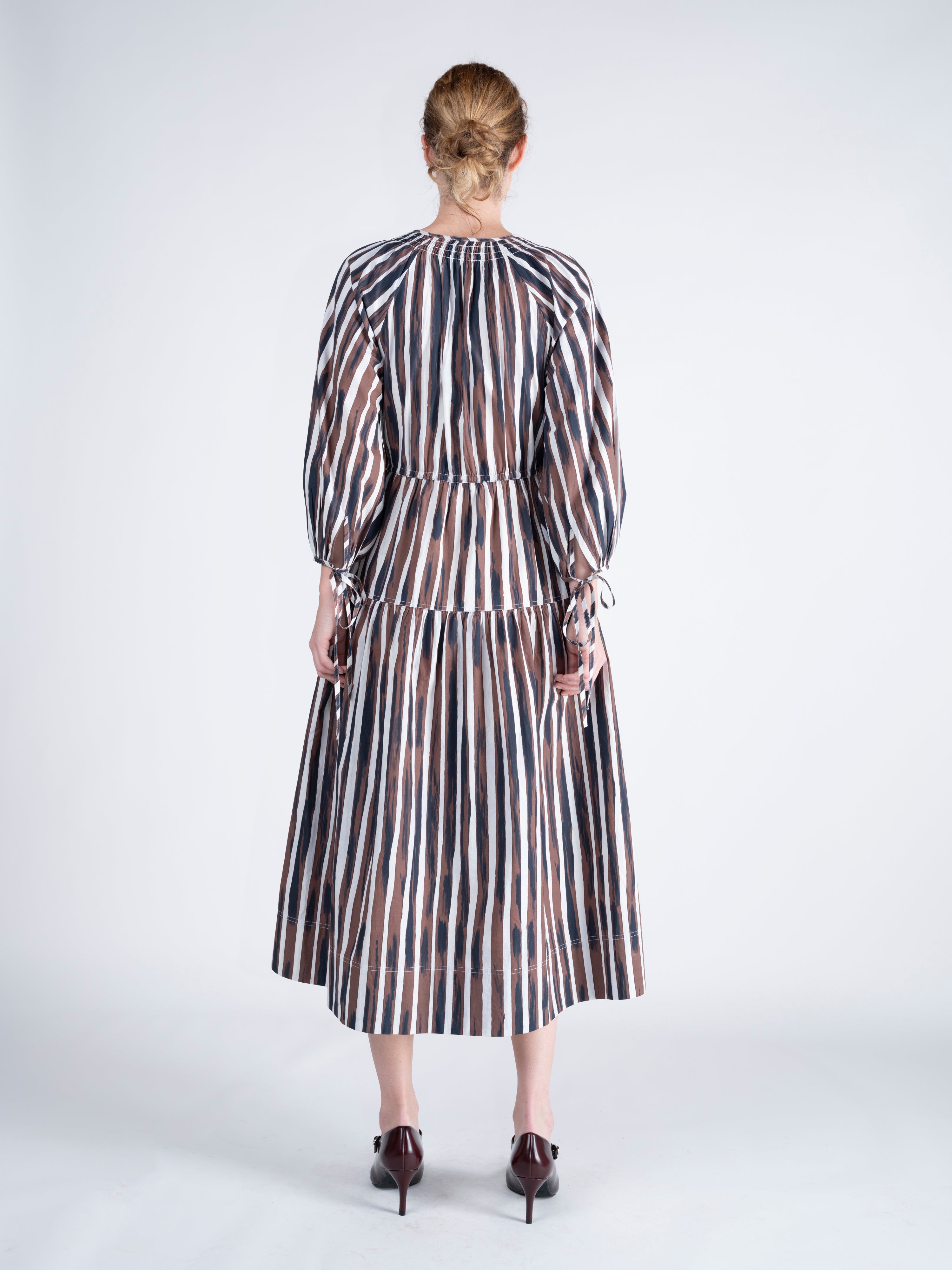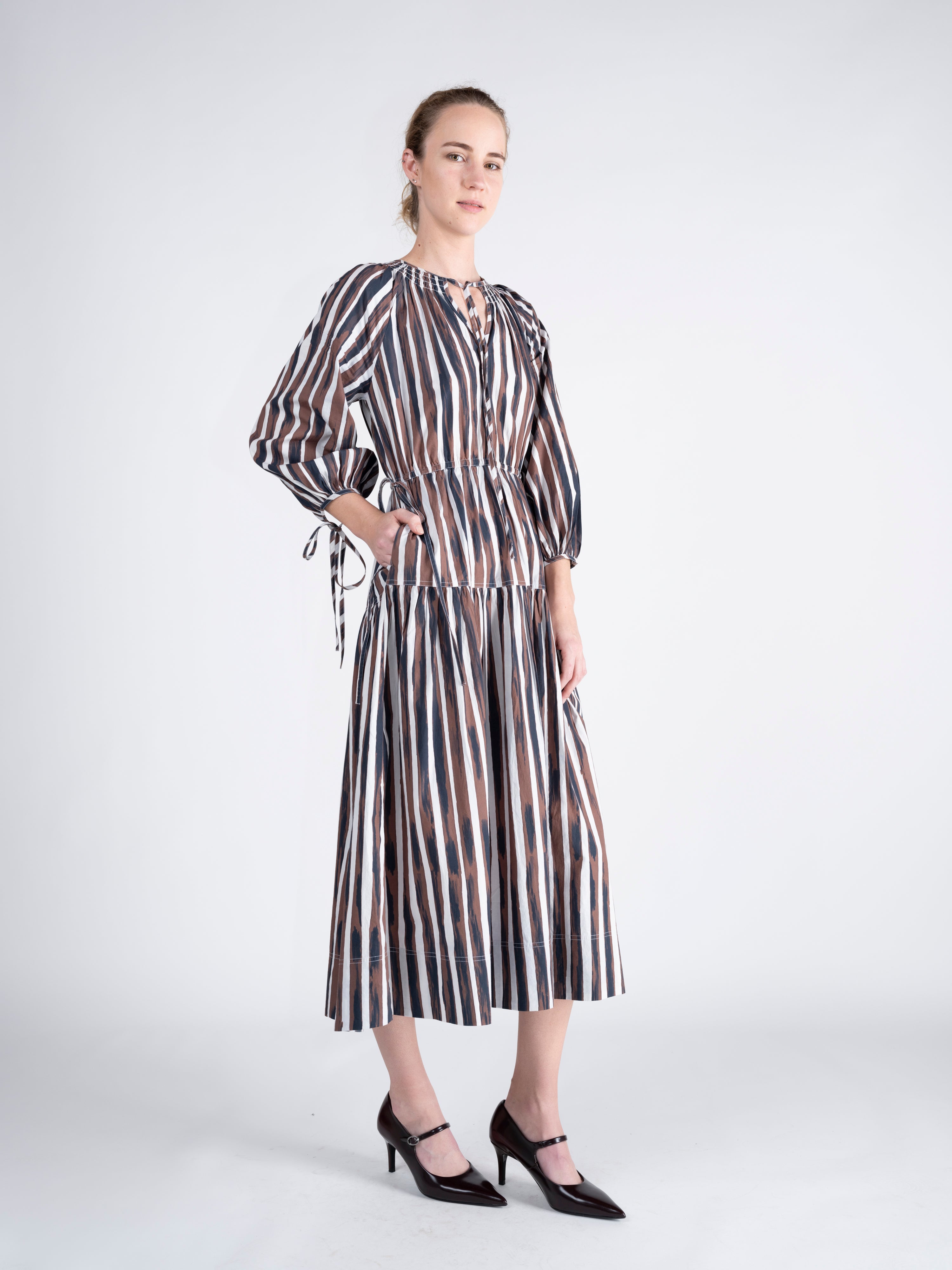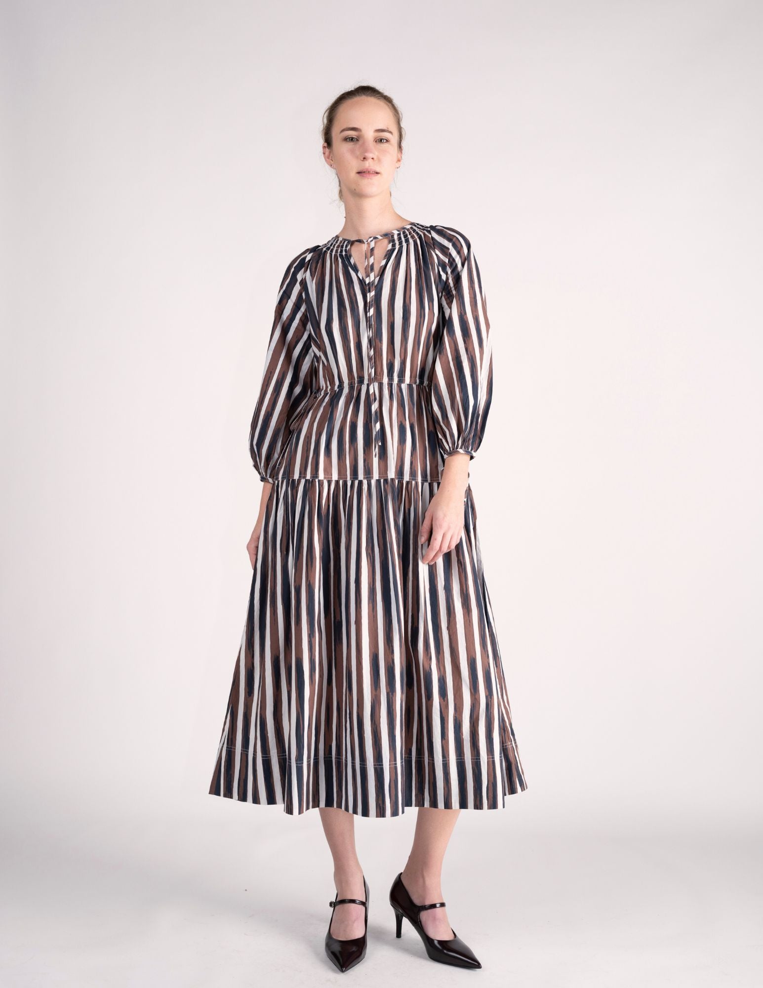 Cotton poplin maxi tent dress with optional spaghetti belt. Front and back V-neckline, accentuated with pleating details. Lightweight cotton voile lining.