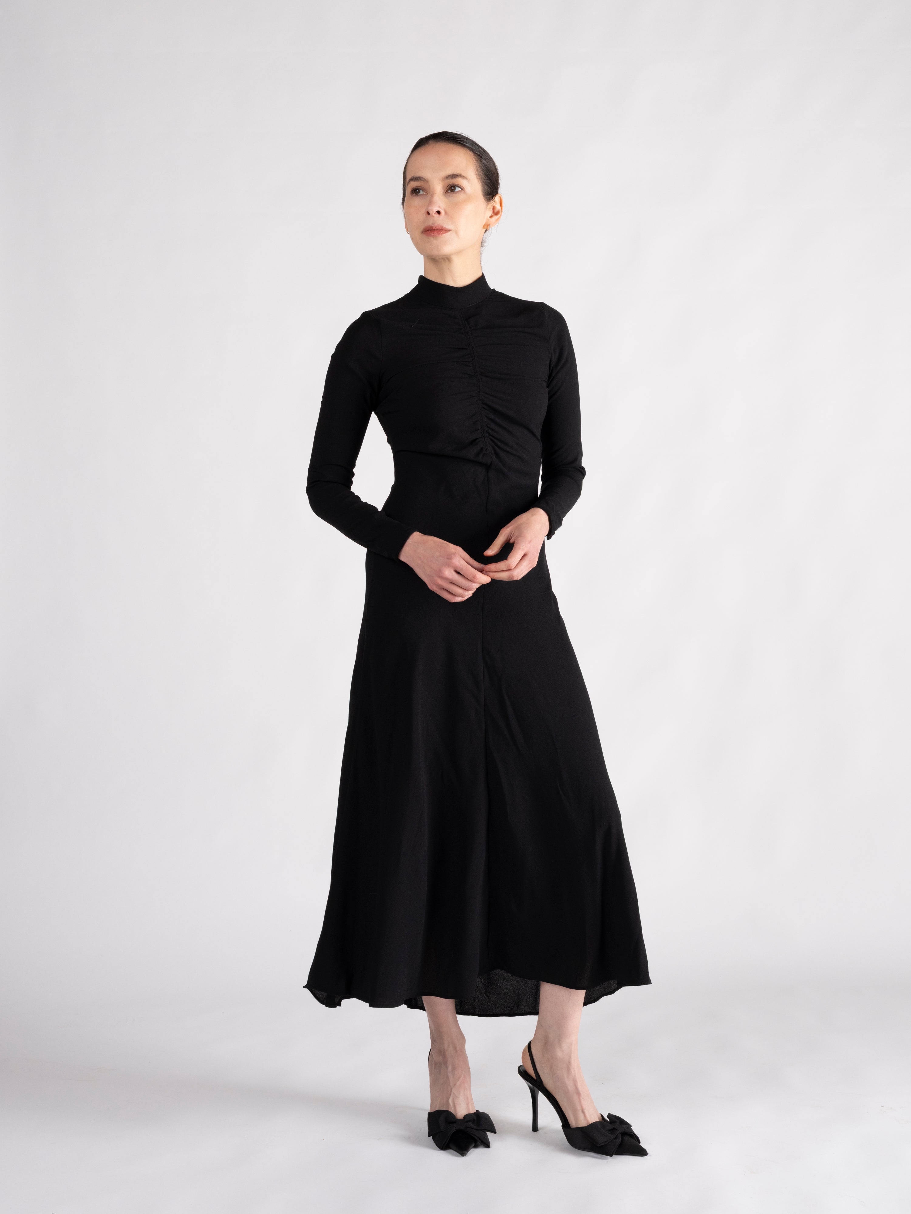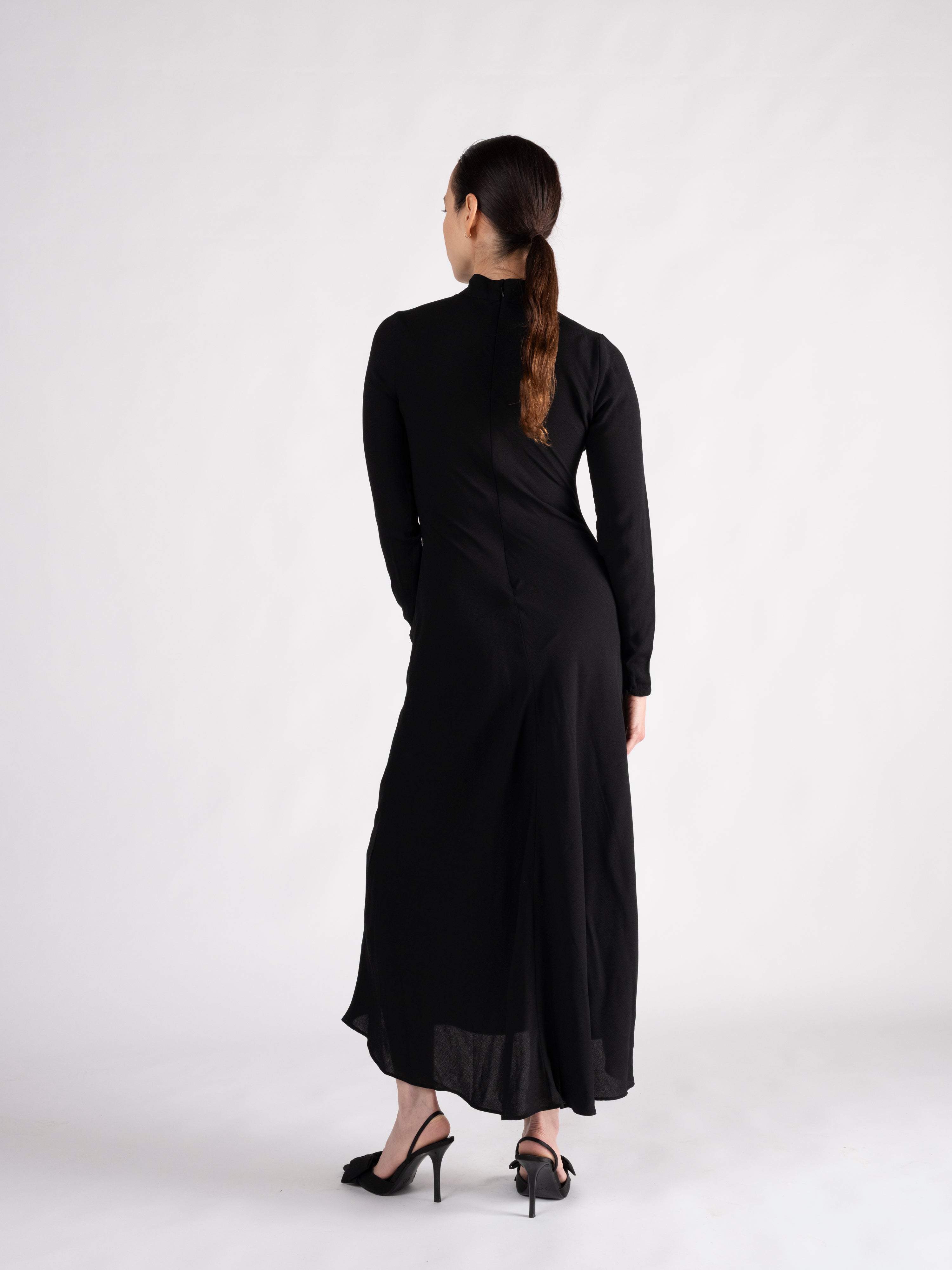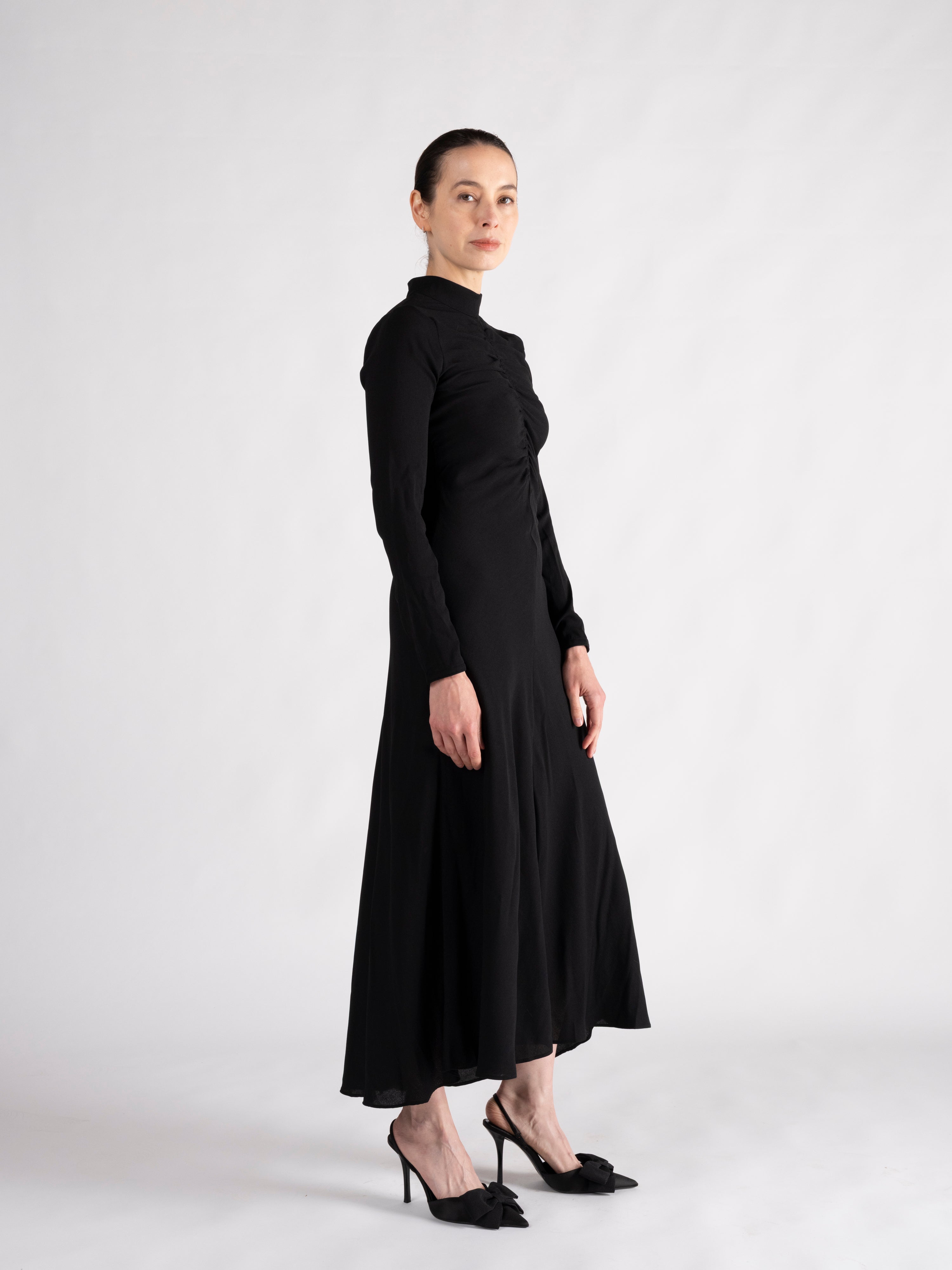 Bias-cut crepe fabric drapes elegantly on the body, with a mock neck collar and ruching down the bodice. Long fitted sleeves close at wrist with a covered button. Invisible zipper closure at back neck. Subtle high-low hemline. Unlined.