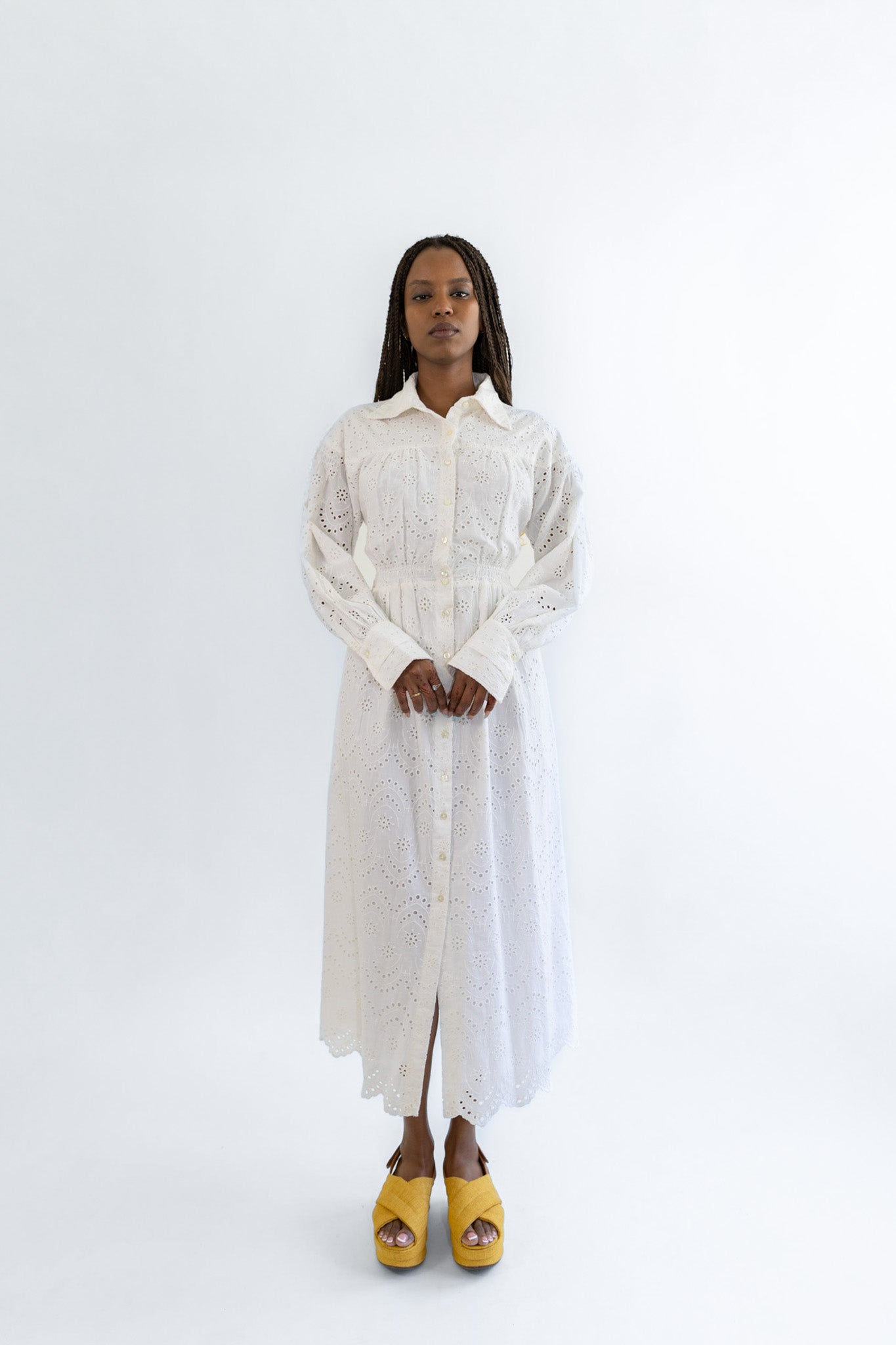 An updated take on a classic shirt dress, the Patti features a combination of beautiful eyelet fabrics paneled down the body. Delicate detailing meets sturdy construction, ensuring this dress will be a staple in your closet season after season. The cinched waist creates a fit-and-flare silhouette, while the voluminous sleeves add a feminine touch. No special detail is spared in this unique dress that's finished to perfection and sure to garner compliments everywhere she goes.