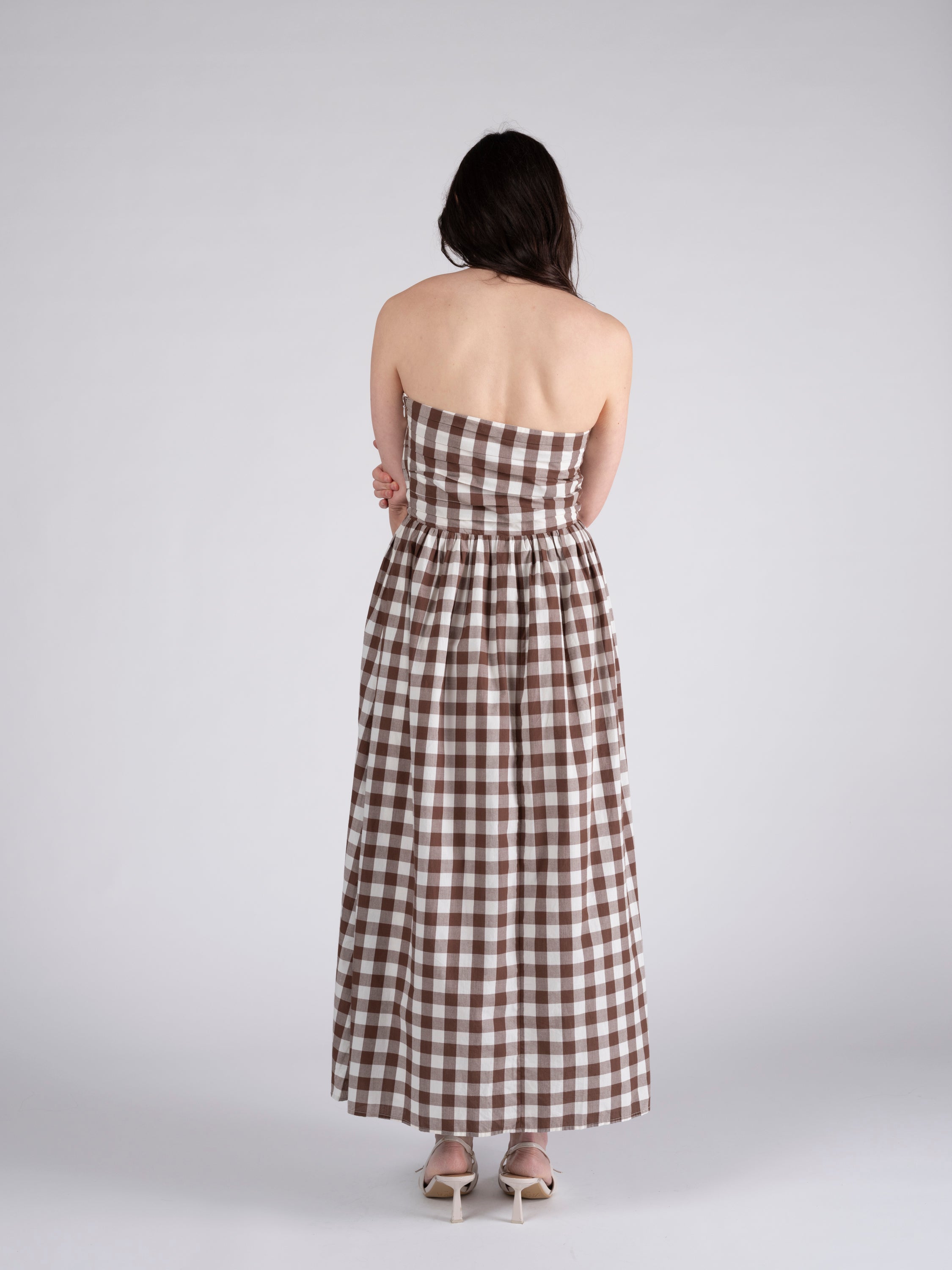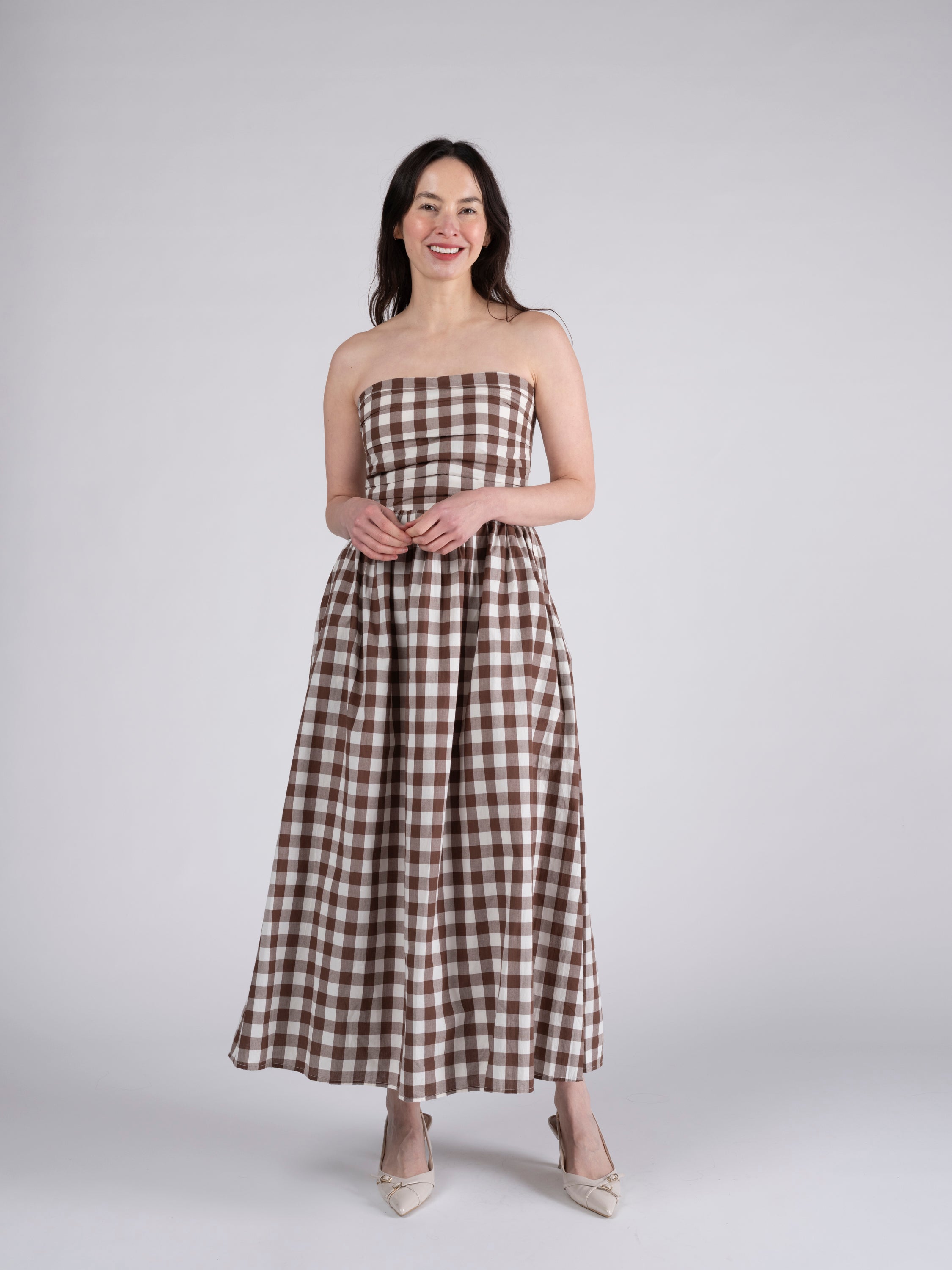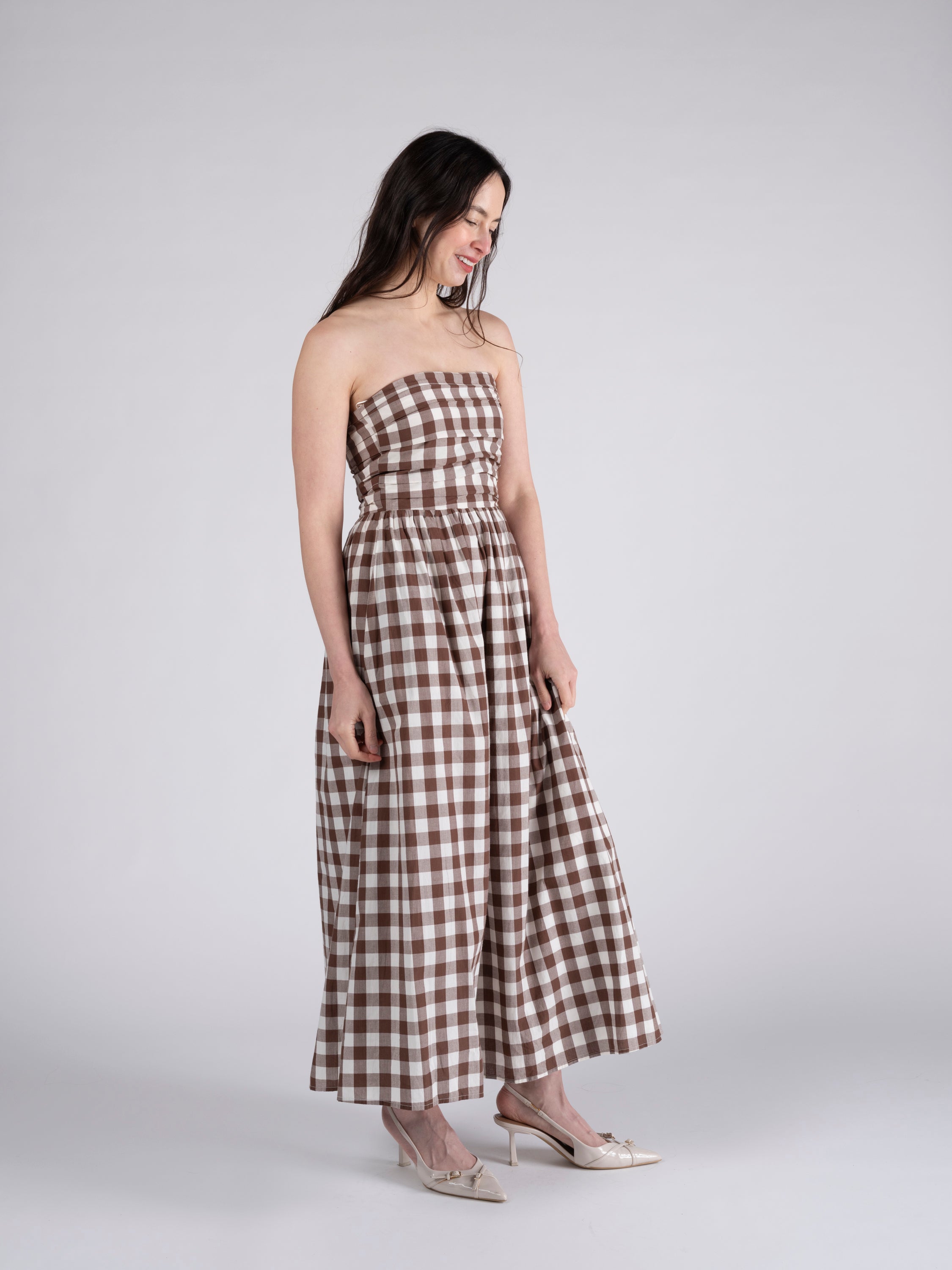 Large pleats drape across the front bodice of this strapless midi dress, creating a flattering, fit-and-flare silhouette. Invisible side seam zipper closure. Lined in cotton voile.