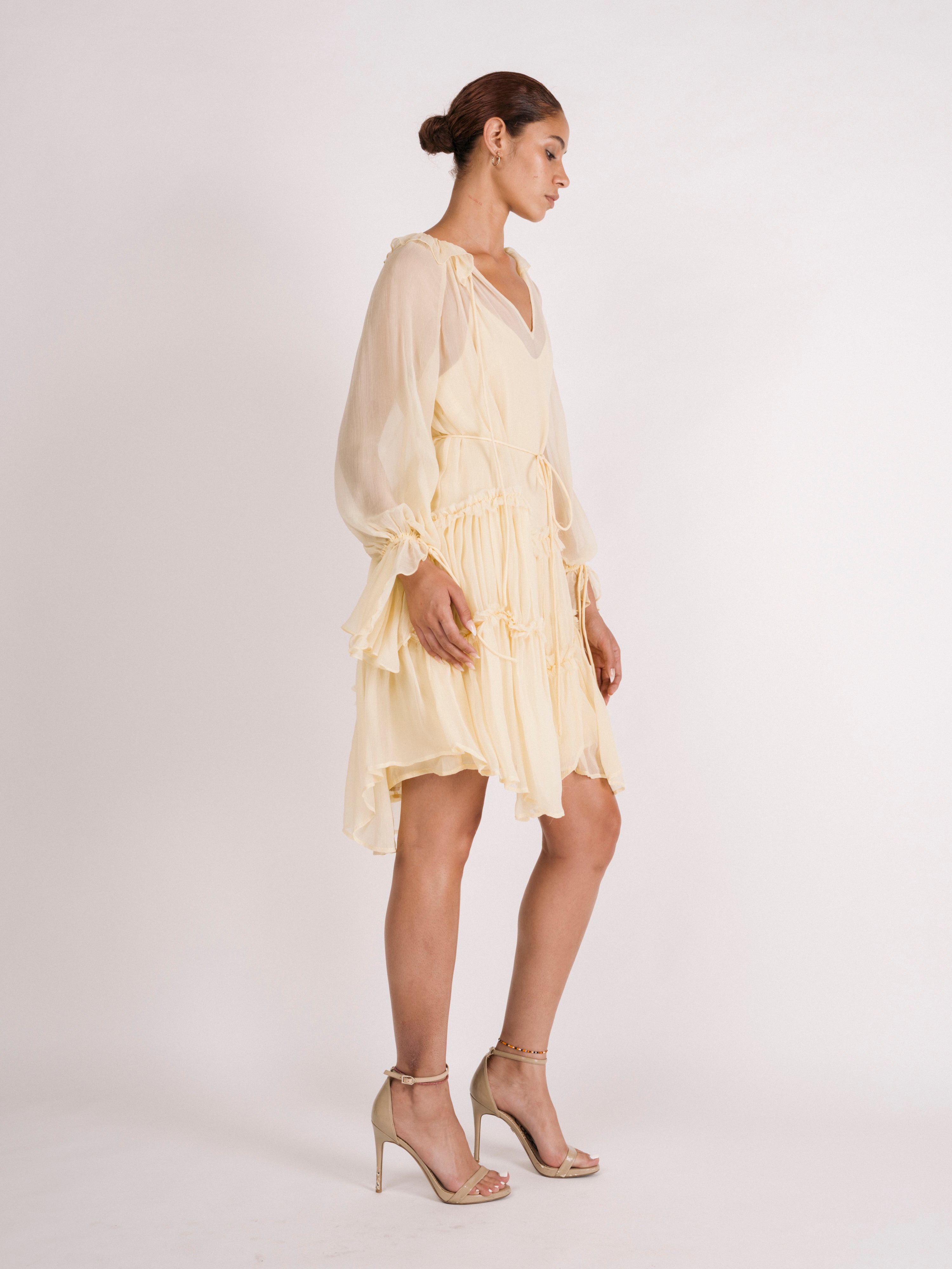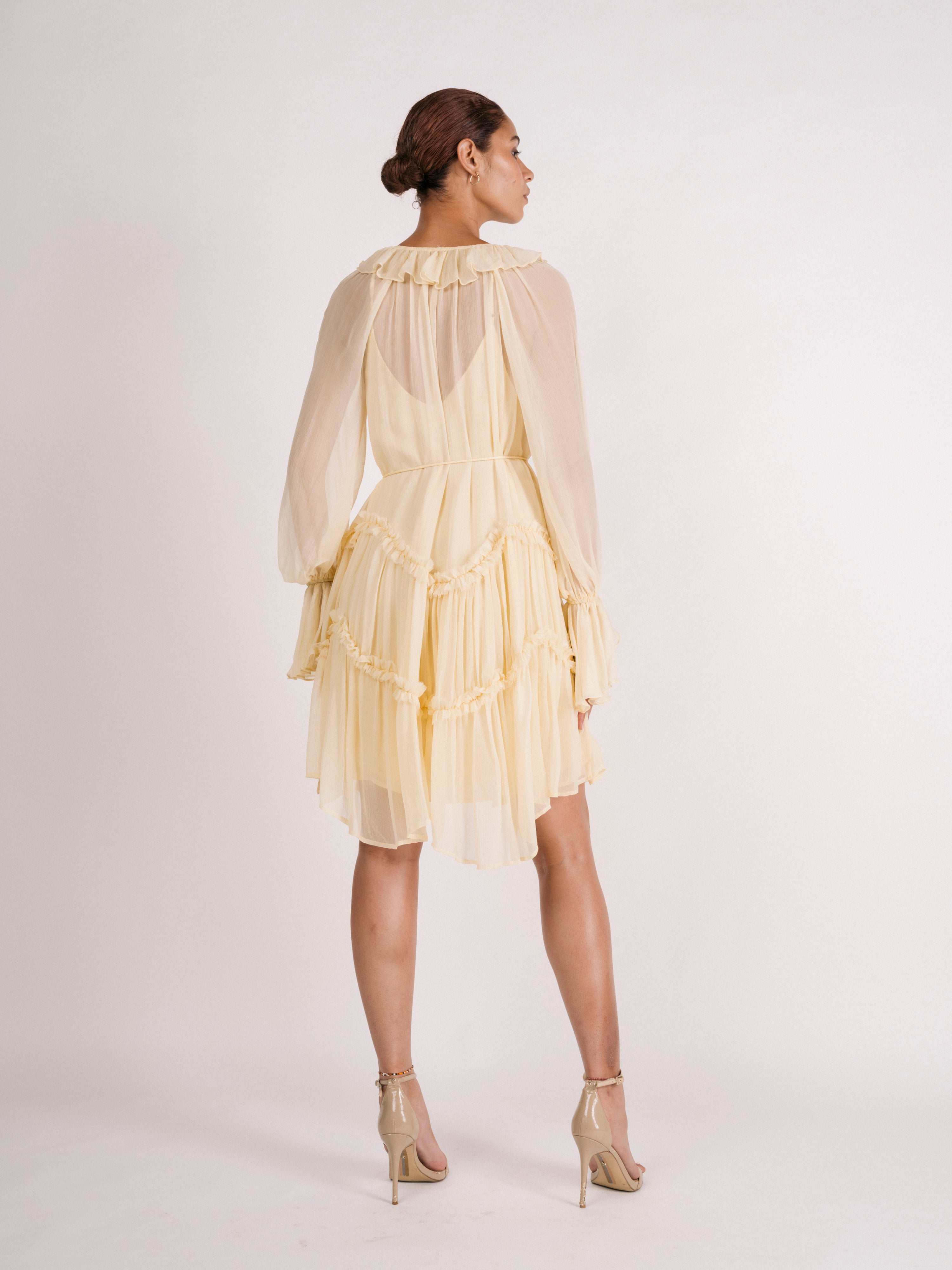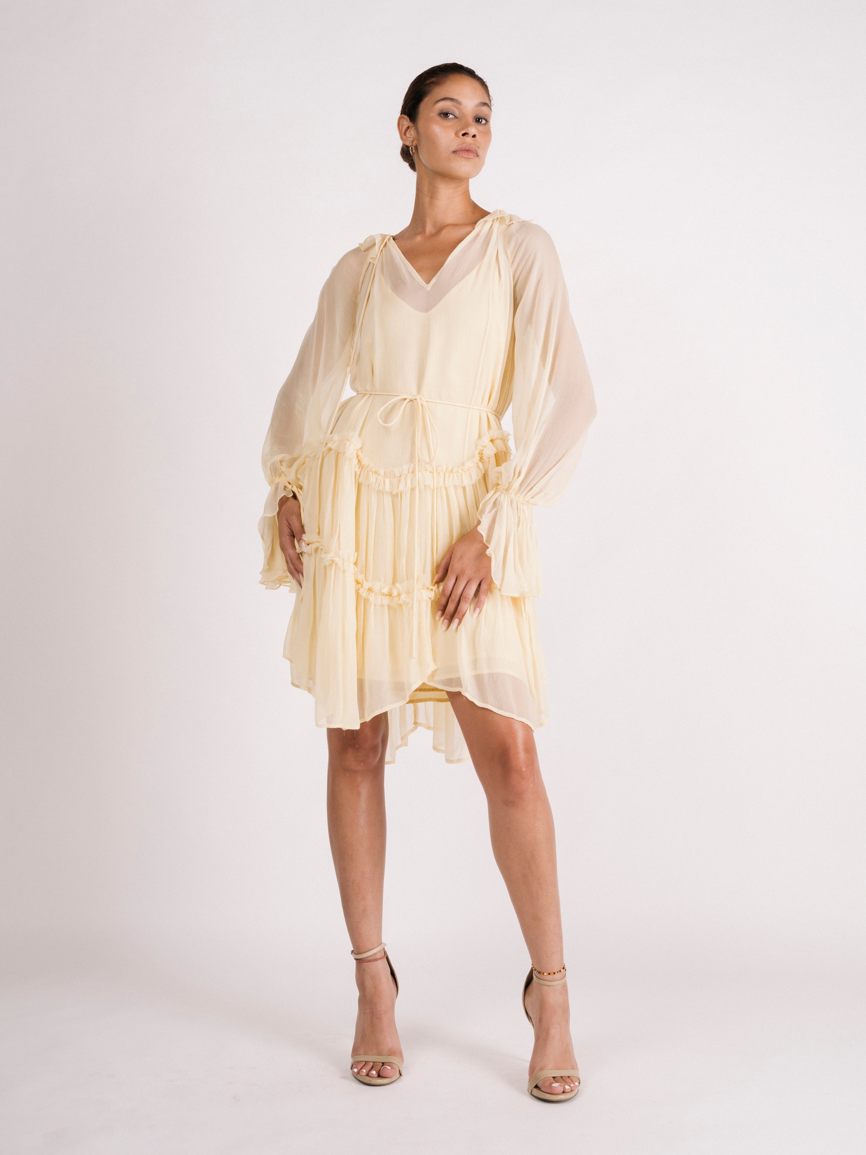 Chiffon ruffles cascade down the body in this tiered mini dress. Option to keep ruffled neckline closed or open with necktie on the front. Option to tie with matching spaghetti belt. Dress is lined with a separate satin lining slip dress.