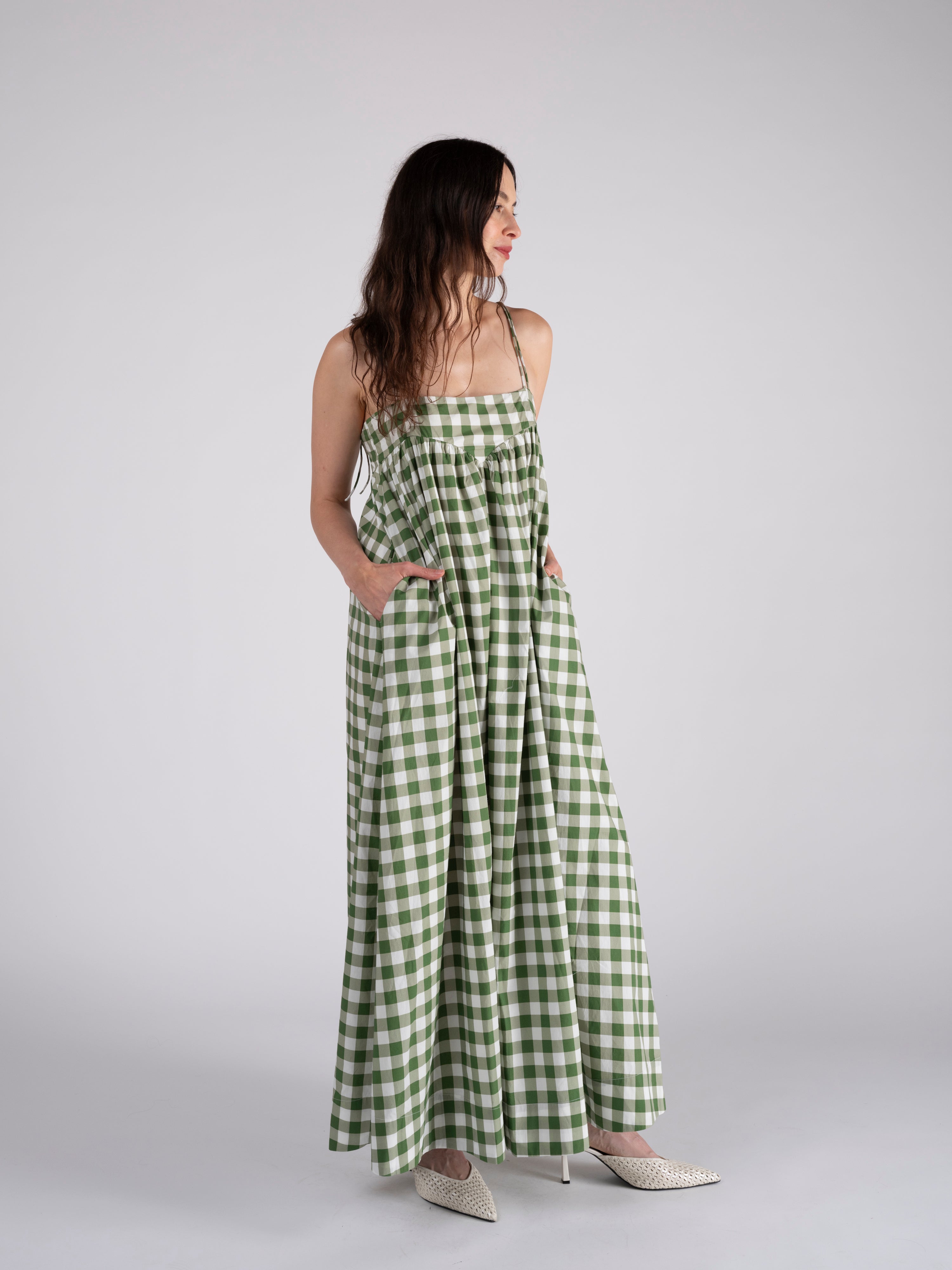 This ankle-length maxi dress features a modern straight cut neckline yoke, releasing into a gathered A-line silhouette, and finished with spaghetti straps that tie at the back for an adjustable fit. Lined in cotton voile.