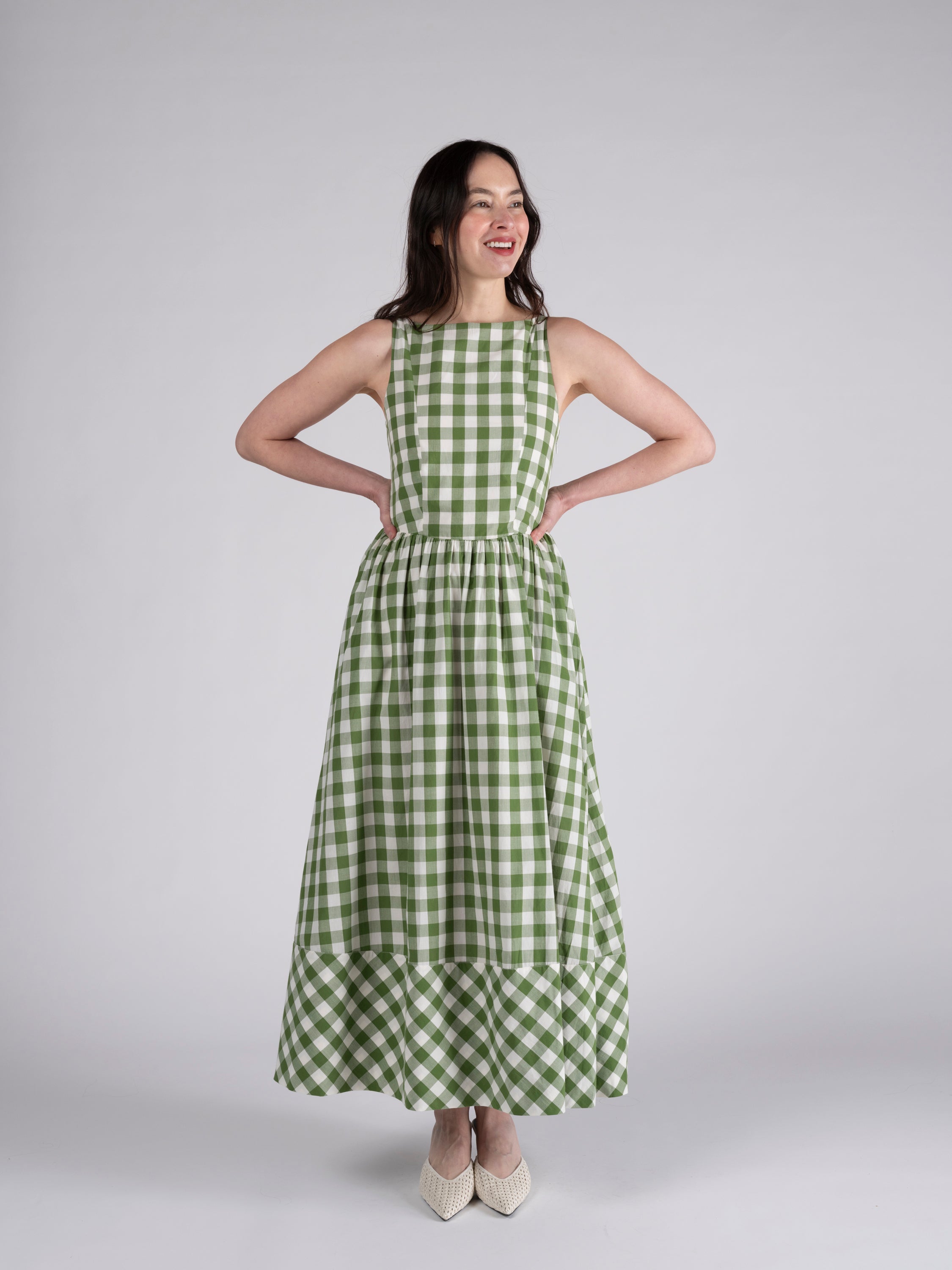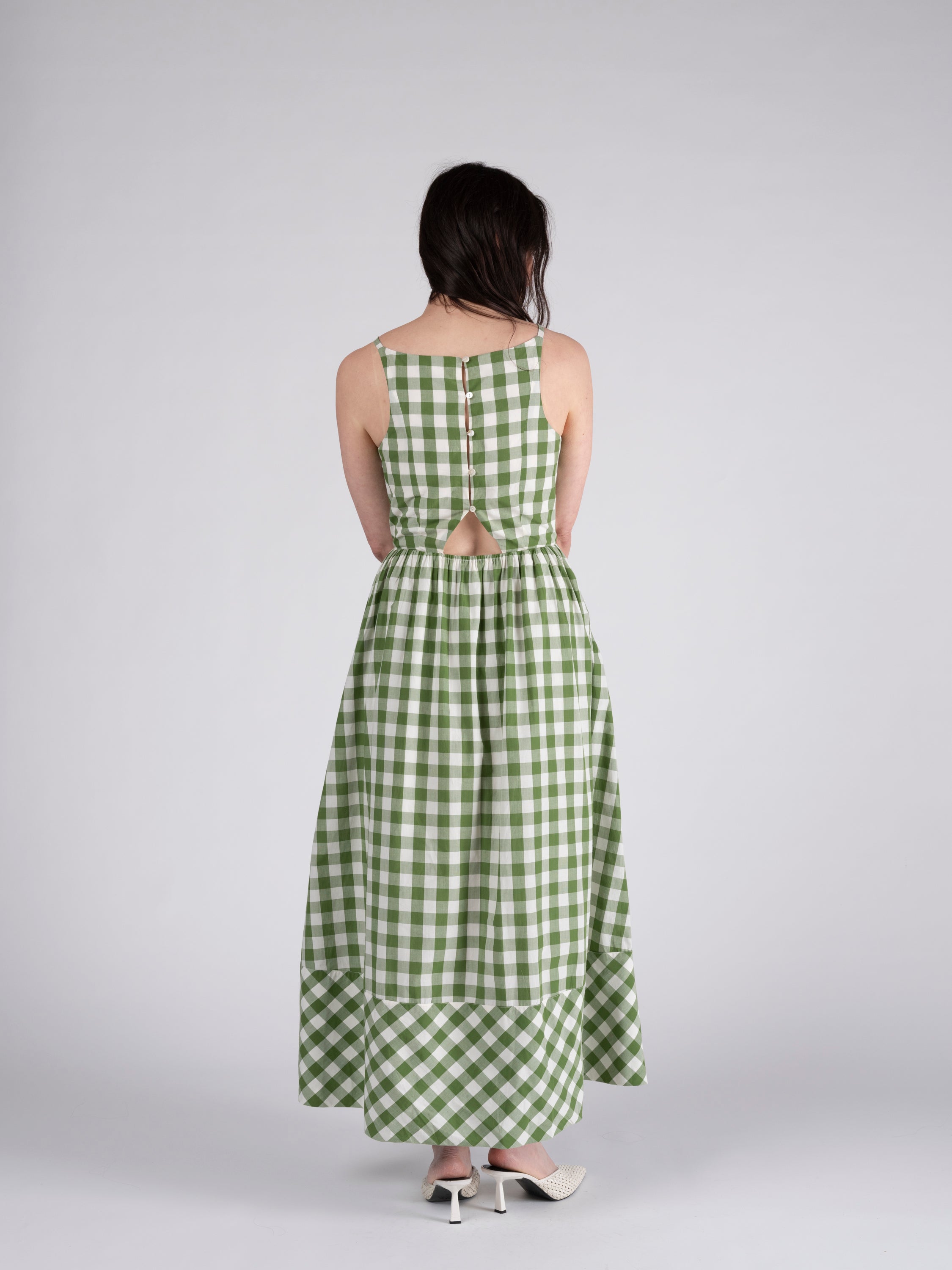 Cotton gingham maxi tent dress with optional spaghetti belt. Front and back V-neckline, accentuated with pleating details. Side seam zipper closure. Removeable spaghetti tie belt. Lightweight cotton voile lining.
