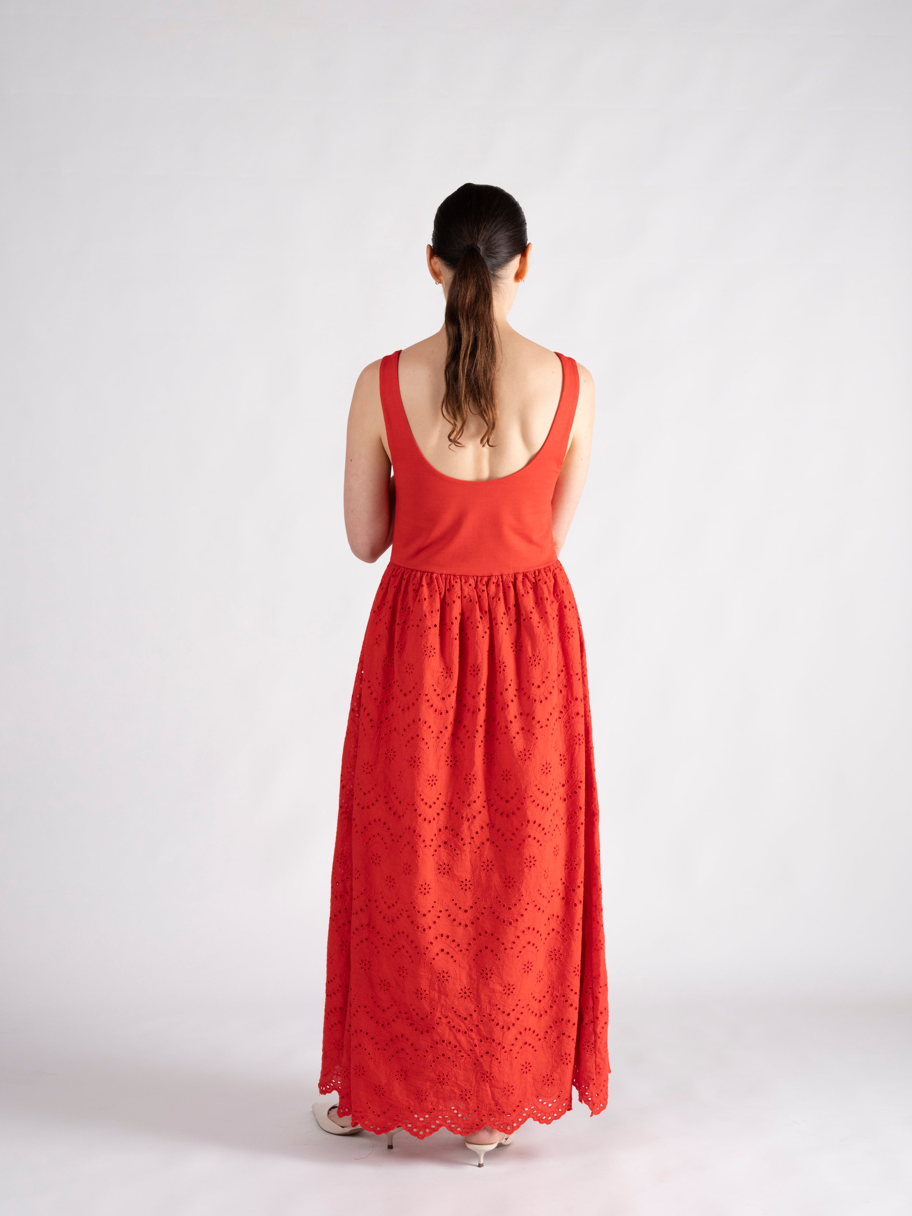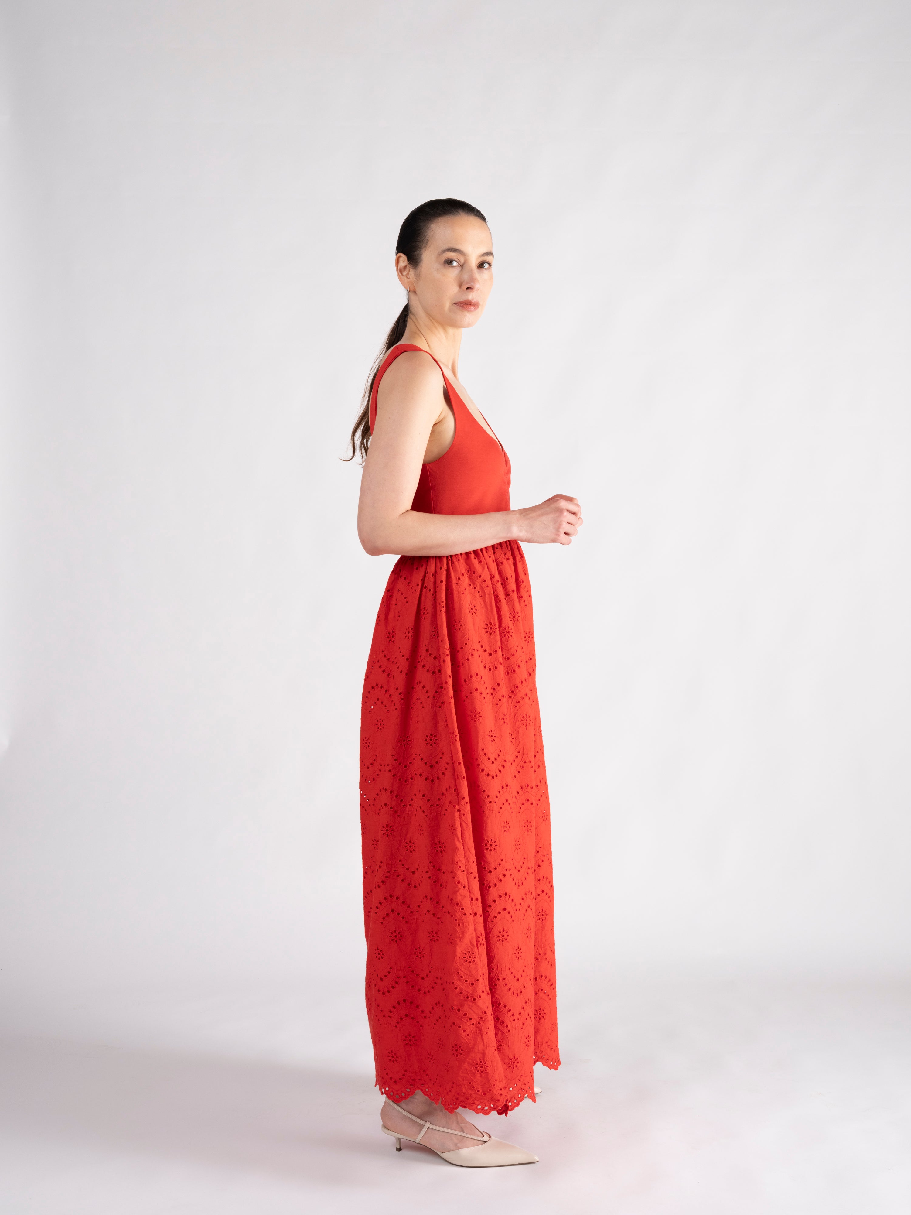 Truly a go-to, "wear everywhere" kind of day dress, the Evangeline pairs a sculpted jersey bodice with the airy romance of a cotton eyelet skirt. A cinched neckline and angled waistline frame the figure, flowing into a sweeping skirt finished with a scalloped hem. The Evangeline is a masterclass in dressing for ease without compromising style.