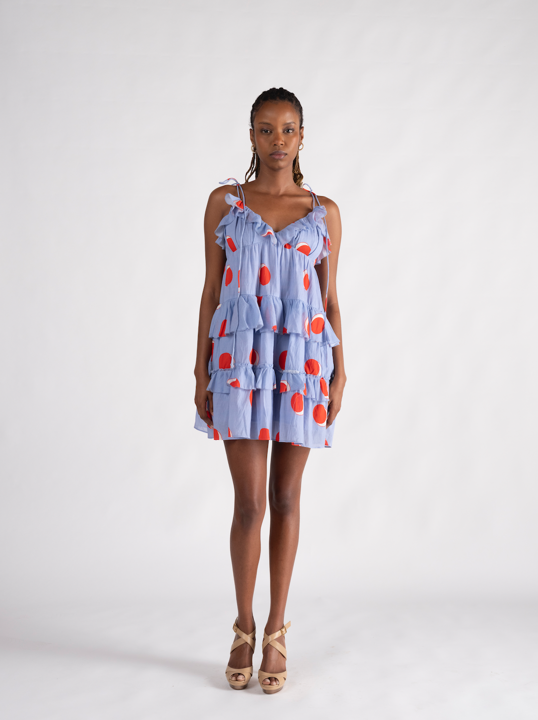 Lighthearted and full of movement, the Nora is equal parts playful and romantic. Its flared silhouette and tiered ruffles create airiness and volume, while an angled empire waistline and ruffled v-neck perfectly frame the neckline. Designed for sunlit days and lingering evenings, it’s a piece that feels both effortless and intentional.